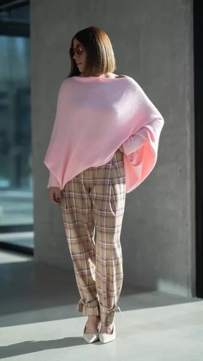 BASTET Spodnie w kratkę z zakładką (beż – róż)