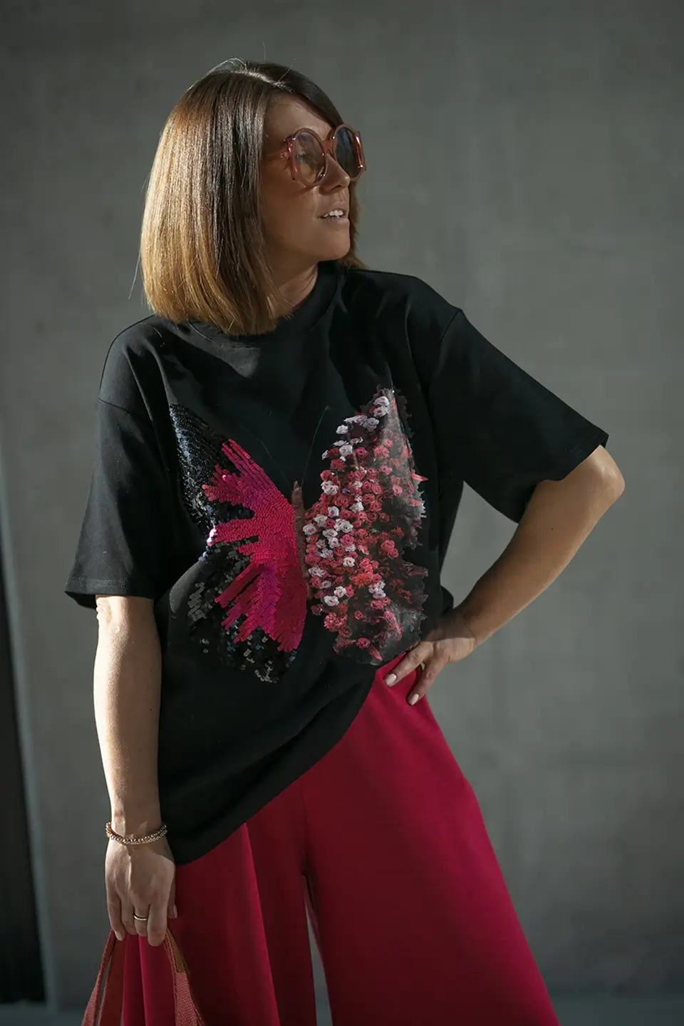 - Oryginalny design: Artystyczny motyw motyla z cekinami wyróżnia się na tle klasycznych T-shirtów.