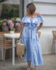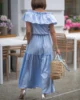 Charakterystycznym elementem tej sukienki jest regulowany dekolt typu carmen (hiszpanka), który można nosić na dwa sposoby – klasycznie, na ramionach, lub zmysłowo odsłaniając ramiona. Dzięki wszytemu wiązaniu w dekolcie, możesz dostosować jego szerokość do swojej sylwetki i preferowanego stylu. To idealne rozwiązanie dla kobiet o różnych kształtach – zarówno tych z większym biustem, jak i drobniejszych, które chcą optycznie zrównoważyć proporcje.