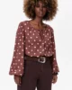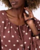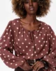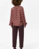 Model zapinany jest na delikatne guziczki, które dodają mu klasy i subtelnego uroku. Długie, szerokie rękawy zostały zebrane w mankiecik zapinany na guziczek, dzięki czemu bluzka zyskuje elegancki, dopracowany charakter. Wiązanie pod szyją z troczkami wykończonymi delikatnym zdobieniem podkreśla kobiecy styl i nadaje całości wyjątkowego wyrazu.