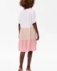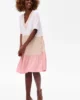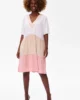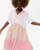 Luźny krój w literę A, zbudowany z dwóch efektownych falban, sprawia, że sukienka pasuje na wiele typów figury, a przy tym skutecznie maskuje niedoskonałości. Krótkie rękawy do łokcia wykończone elastyczną gumką dodają lekkości, a dekolt w serek z ozdobnym haftem subtelnie wysmukla szyję i dodaje całości delikatnego, kobiecego charakteru.