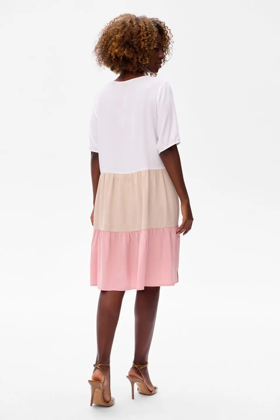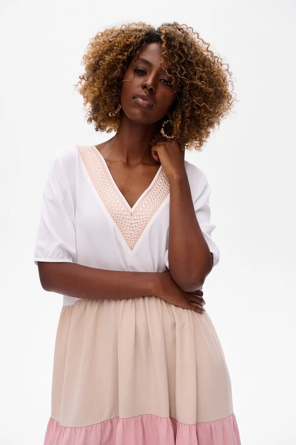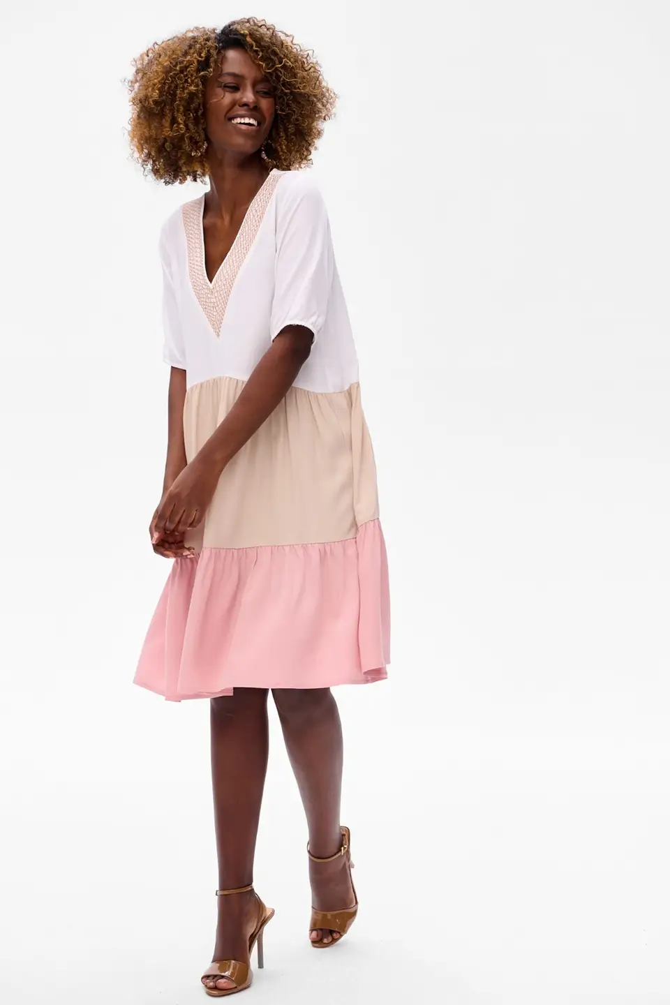 Luźny krój w literę A, zbudowany z dwóch efektownych falban, sprawia, że sukienka pasuje na wiele typów figury, a przy tym skutecznie maskuje niedoskonałości. Krótkie rękawy do łokcia wykończone elastyczną gumką dodają lekkości, a dekolt w serek z ozdobnym haftem subtelnie wysmukla szyję i dodaje całości delikatnego, kobiecego charakteru.