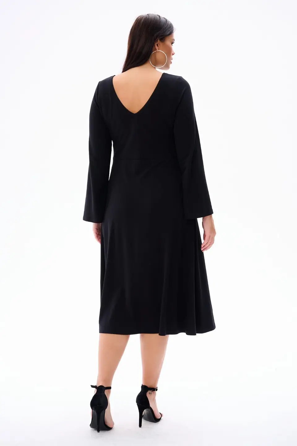Największym atutem sukienki jest jej zaskakujący, odwrócony układ dekoltów – z przodu klasyczny, półokrągły, a z tyłu zmysłowy dekolt w kształcie litery V. Zarówno z przodu, jak i z tyłu, linia dekoltu została wykończona delikatną koronką, która dodaje kobiecego uroku. Długie, rozszerzane rękawy nadają całości lekkości i wyjątkowego stylu.