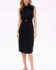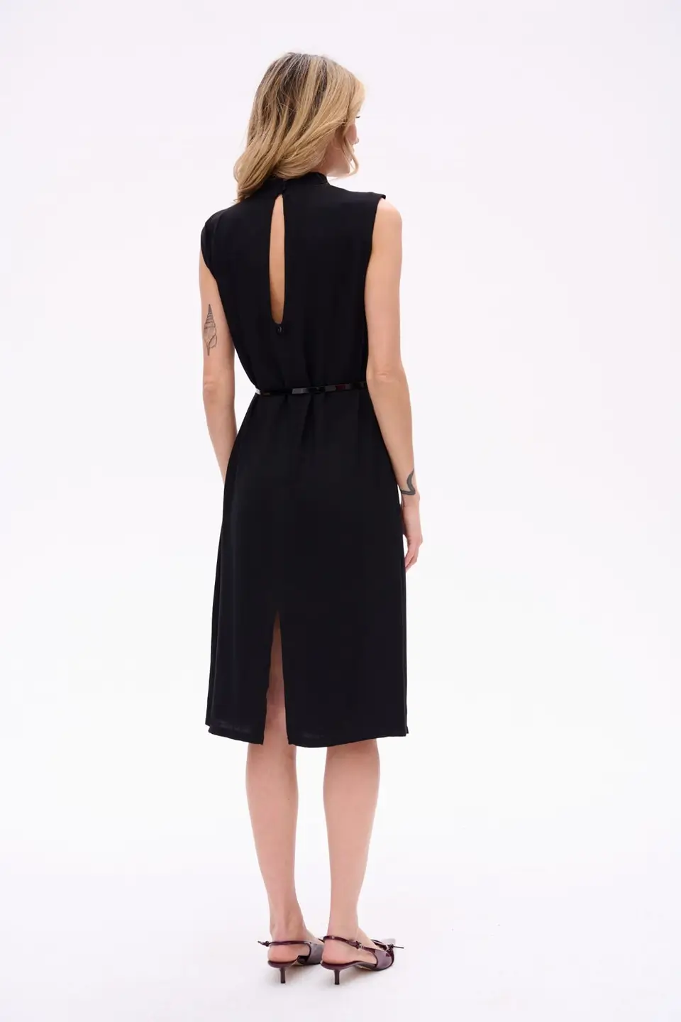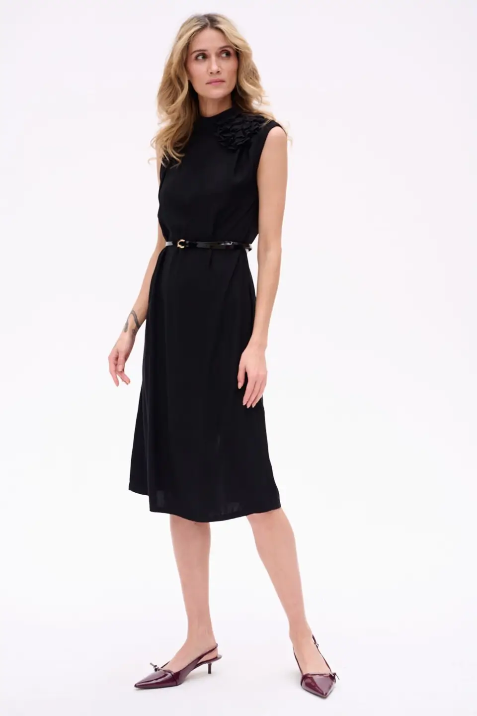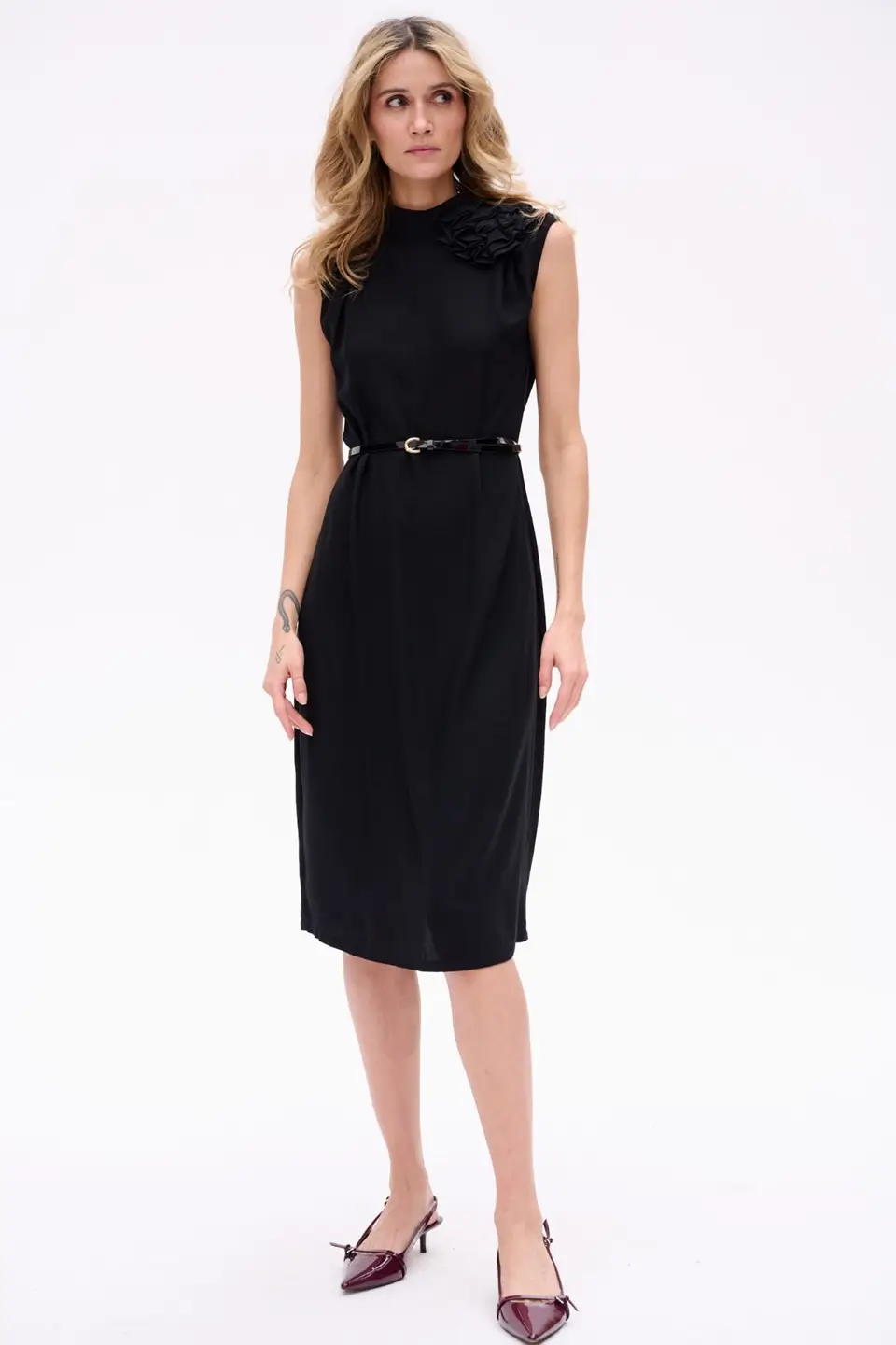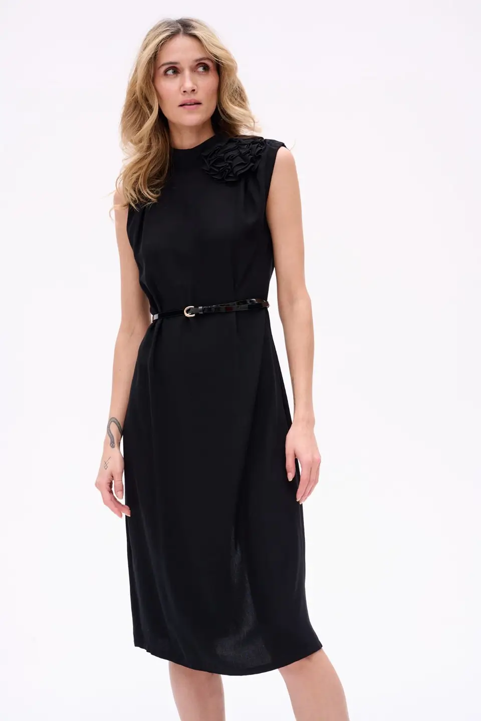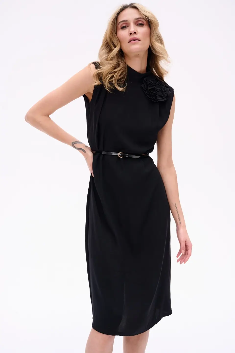 Elegancka sukienka midi bez rękawów, o prostym kroju, idealna na specjalne okazje. ROSALI zachwyca subtelną długością za kolano i dopracowanymi detalami, które przyciągają spojrzenia. Ozdobny kwiat przy szyi dodaje romantyzmu, a delikatne marszczenia na ramionach wprowadzają nutę finezji. Dekolt na stójce zapinany z tyłu na guziczki oraz rozcięcie odsłaniające fragment pleców czynią tę sukienkę wyjątkową i zmysłową – bez nadmiernej ekstrawagancji.