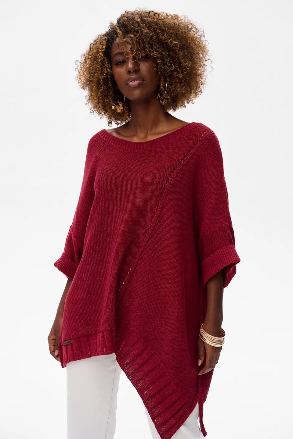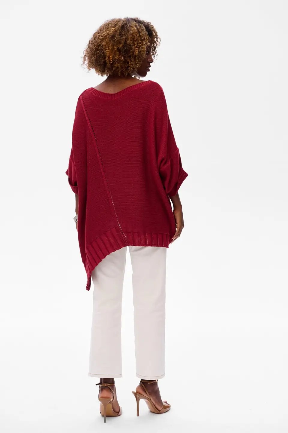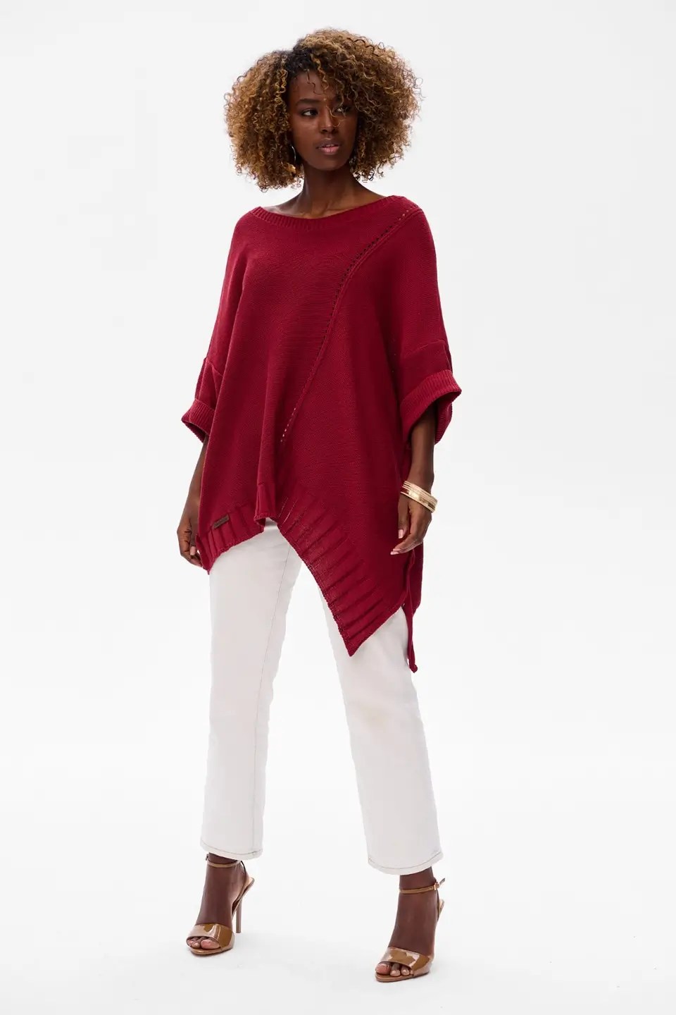 Sweter wykonany jest w luźnym, oversize’owym kroju, który doskonale maskuje ewentualne niedoskonałości sylwetki i pozwala czuć się swobodnie w każdej sytuacji. Asymetryczny dół, którego długość waha się od 72 cm z przodu do 87 cm z tyłu, nadaje całości modnego charakteru i subtelnie wysmukla sylwetkę. Taki krój świetnie komponuje się zarówno z dopasowanymi spodniami, jak i legginsami czy spódnicami ołówkowymi.