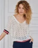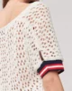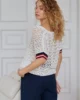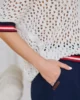 Uwagę zwraca także oryginalne wykończenie – kontrastowe ściągacze z elastycznej gumy w granatowo-czerwonym odcieniu, umieszczone przy rękawach oraz na dole bluzki. To subtelne detale, które nie tylko dodają charakteru całej stylizacji, ale też przywołują na myśl klasyczny styl marynistyczny. Kolorystyka: czysta biel z wyrazistym granatem i czerwienią sprawia, że ten model świetnie wpisuje się w letnie, wakacyjne trendy, nie tracąc przy tym elegancji.