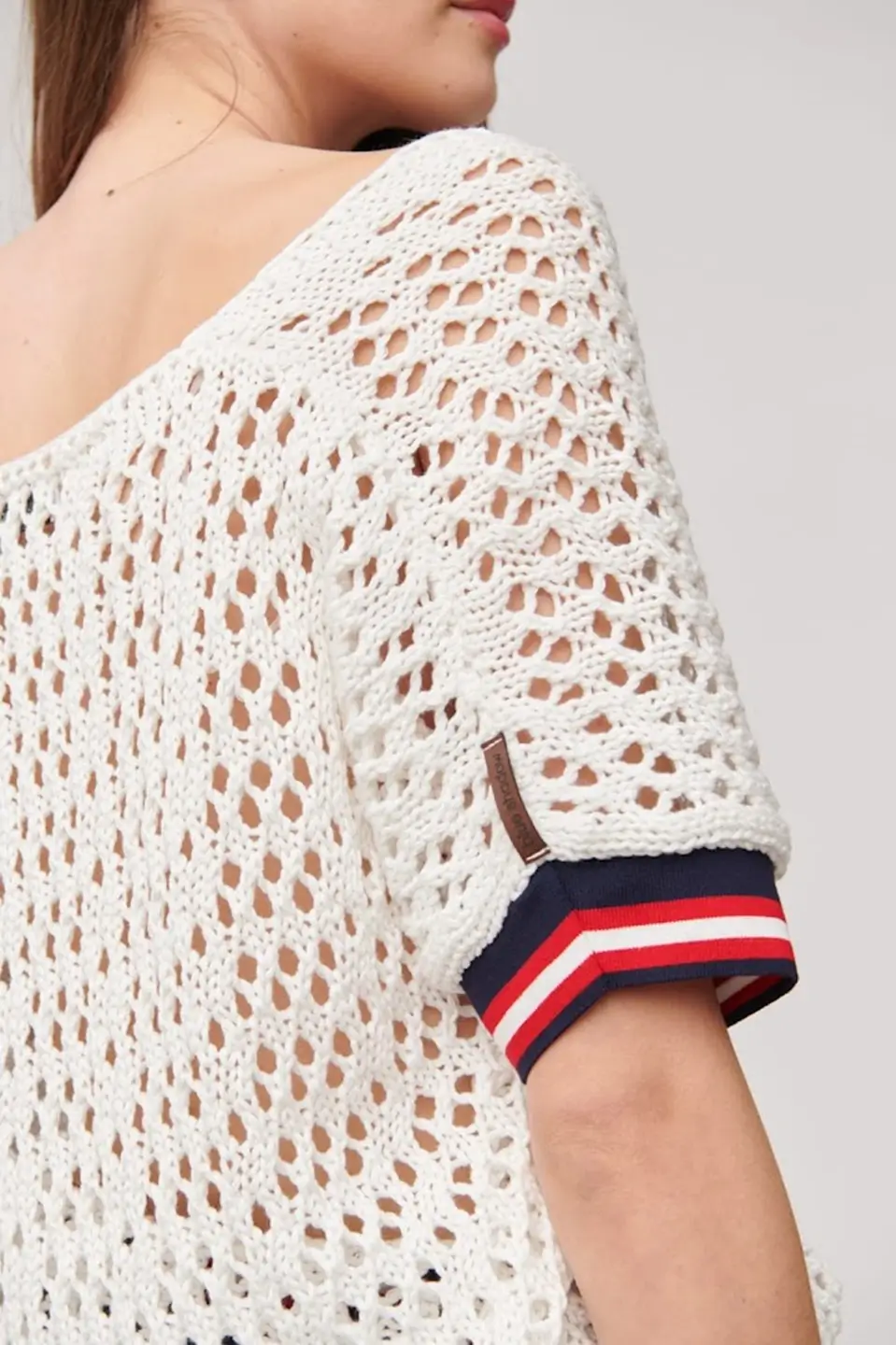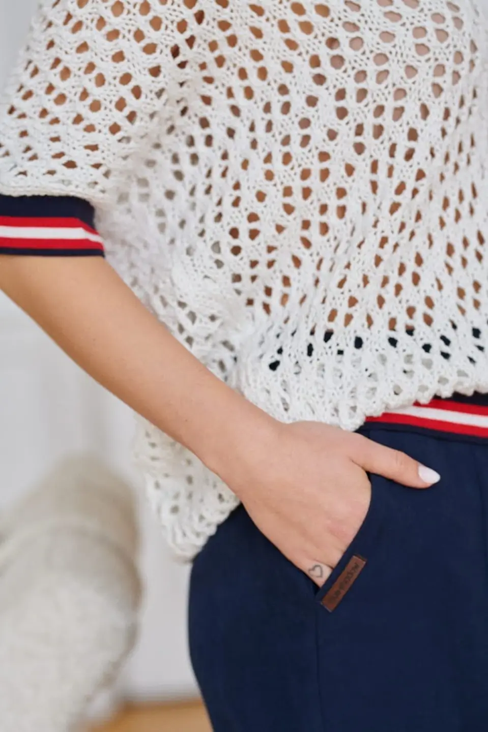 Uwagę zwraca także oryginalne wykończenie – kontrastowe ściągacze z elastycznej gumy w granatowo-czerwonym odcieniu, umieszczone przy rękawach oraz na dole bluzki. To subtelne detale, które nie tylko dodają charakteru całej stylizacji, ale też przywołują na myśl klasyczny styl marynistyczny. Kolorystyka: czysta biel z wyrazistym granatem i czerwienią sprawia, że ten model świetnie wpisuje się w letnie, wakacyjne trendy, nie tracąc przy tym elegancji.