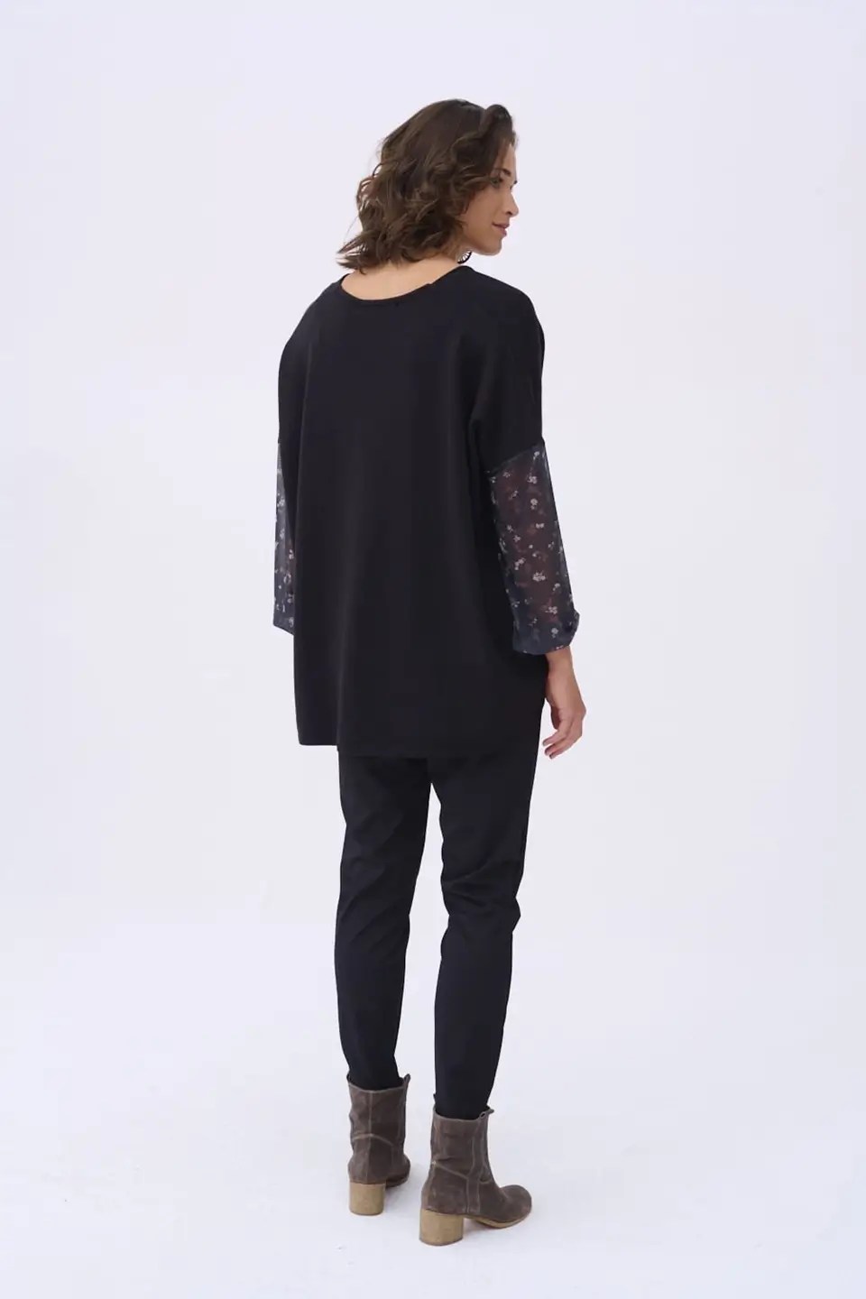 - Wyjątkowy design – połączenie naszytej aplikacji z siatkowymi rękawami wyróżnia ten model na tle klasycznych swetrów.