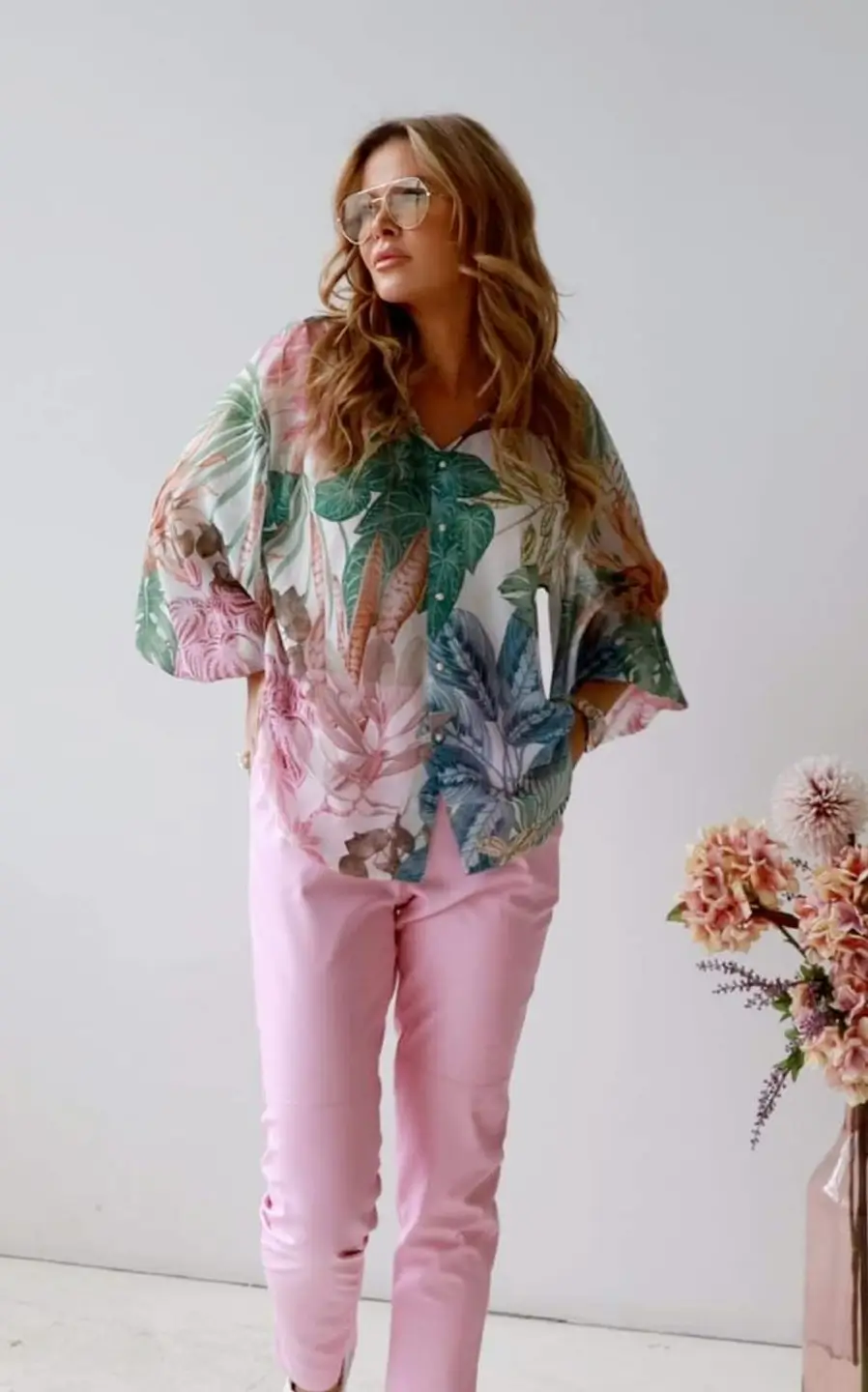 Bluzka posiada dekolt w serek, który podkreśla kobiecość, oraz szerokie rękawy zakończone gumeczką, dodając stylowego akcentu. Dekoracyjne napki imitujące guziczki to dodatkowy element, który nadaje bluzce eleganckiego wyglądu. Idealna na każdą okazję – od codziennych stylizacji po bardziej formalne wyjścia.