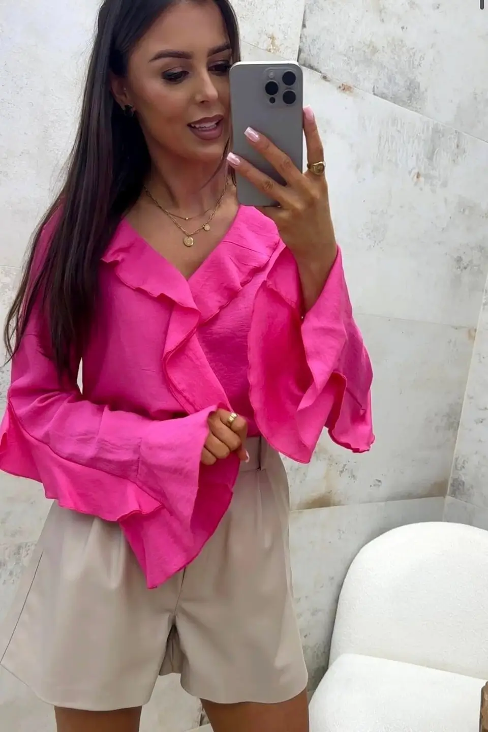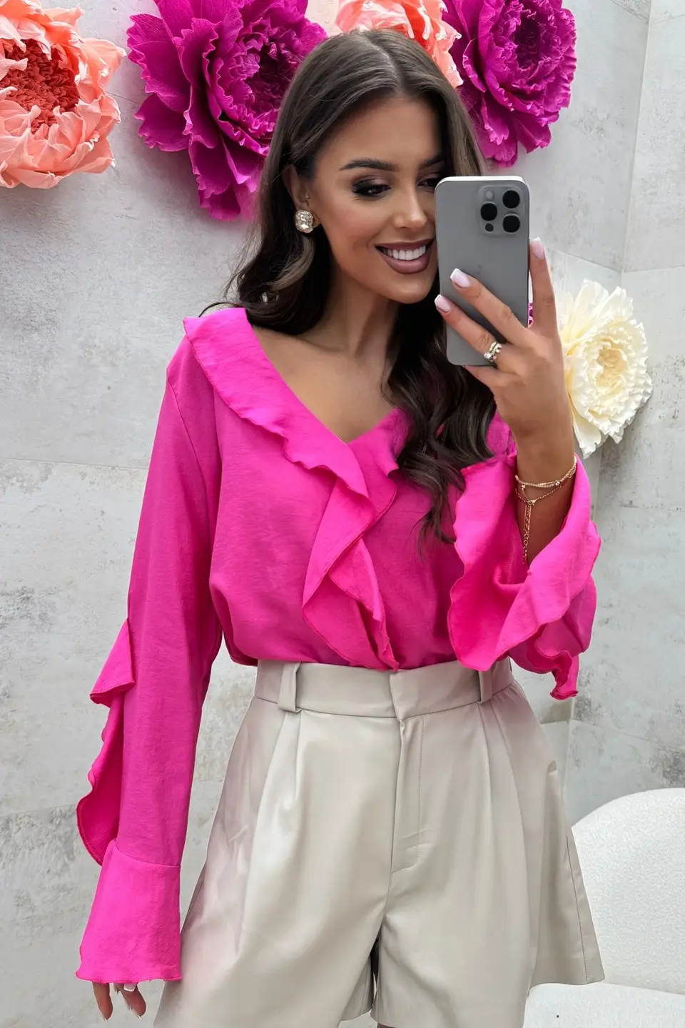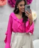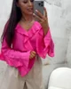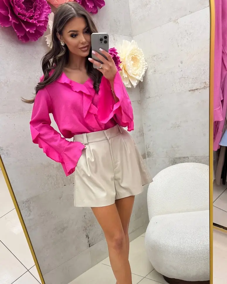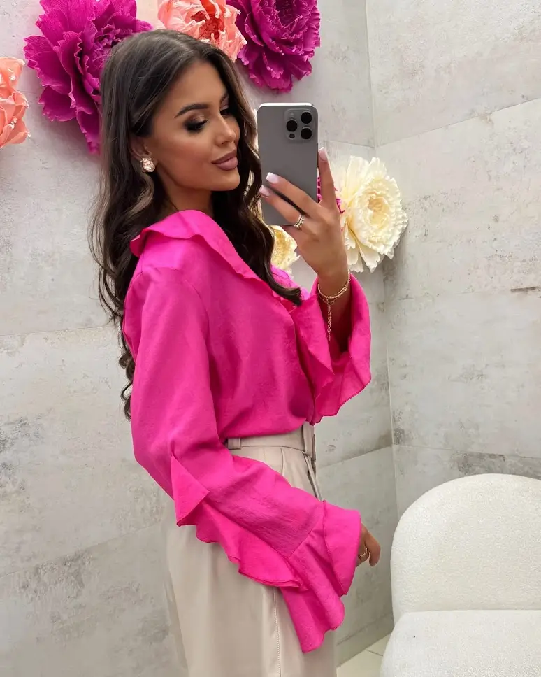 Bluzka jest subtelnie rozszerzana ku dołowi, co pięknie układa się na sylwetce i maskuje niedoskonałości. Ozdobne falbanki na rękawach, dekolcie i dole bluzki dodają jej kobiecego uroku i sprawiają, że każda stylizacja zyskuje wyjątkowy charakter.