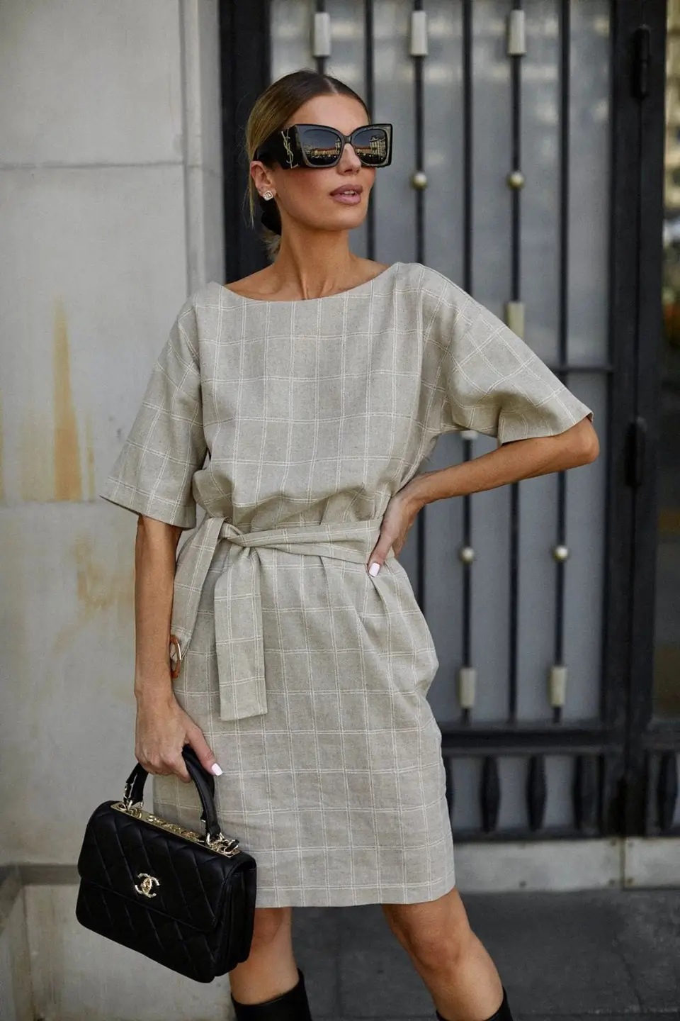 Sukienka SEVILLA to ponadczasowa, sportowa elegancja. Przeszyta delikatną złotą nitką. Sukienka posiada kieszonki. Możemy ją nosić na dwa sposoby: z paskiem lub bez – nie posiada szlufek. Ozdobna, elegancka, złota, metalowa klamerka. Sukienkę możemy nosić na co dzień, a także na specjalne okazje. Wygoda i styl 100%