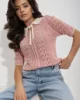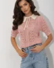 Subtelny, ażurowy sweterek o krótszym fasonie, wykończony dekoracyjnym kołnierzykiem z wiązaniem. Delikatna dzianina i starannie wykonane detale tworzą romantyczny, lekki charakter — idealny zarówno do codziennych stylizacji, jak i bardziej eleganckich zestawów.