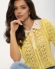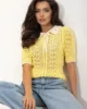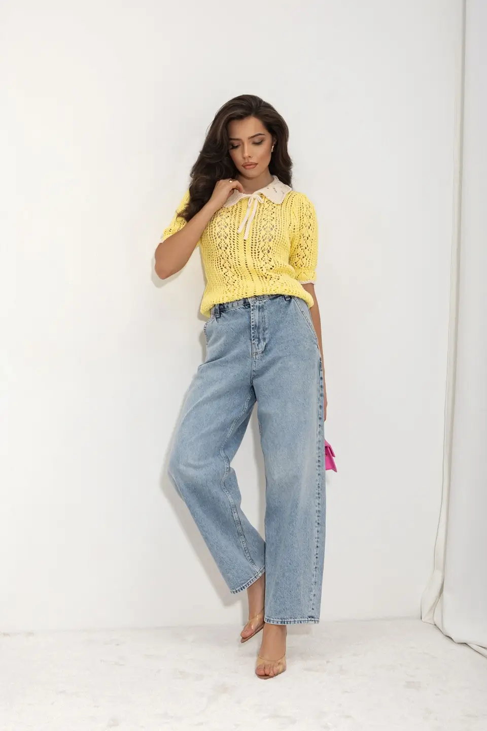 Subtelny, ażurowy sweterek o krótszym fasonie, wykończony dekoracyjnym kołnierzykiem z wiązaniem. Delikatna dzianina i starannie wykonane detale tworzą romantyczny, lekki charakter — idealny zarówno do codziennych stylizacji, jak i bardziej eleganckich zestawów.