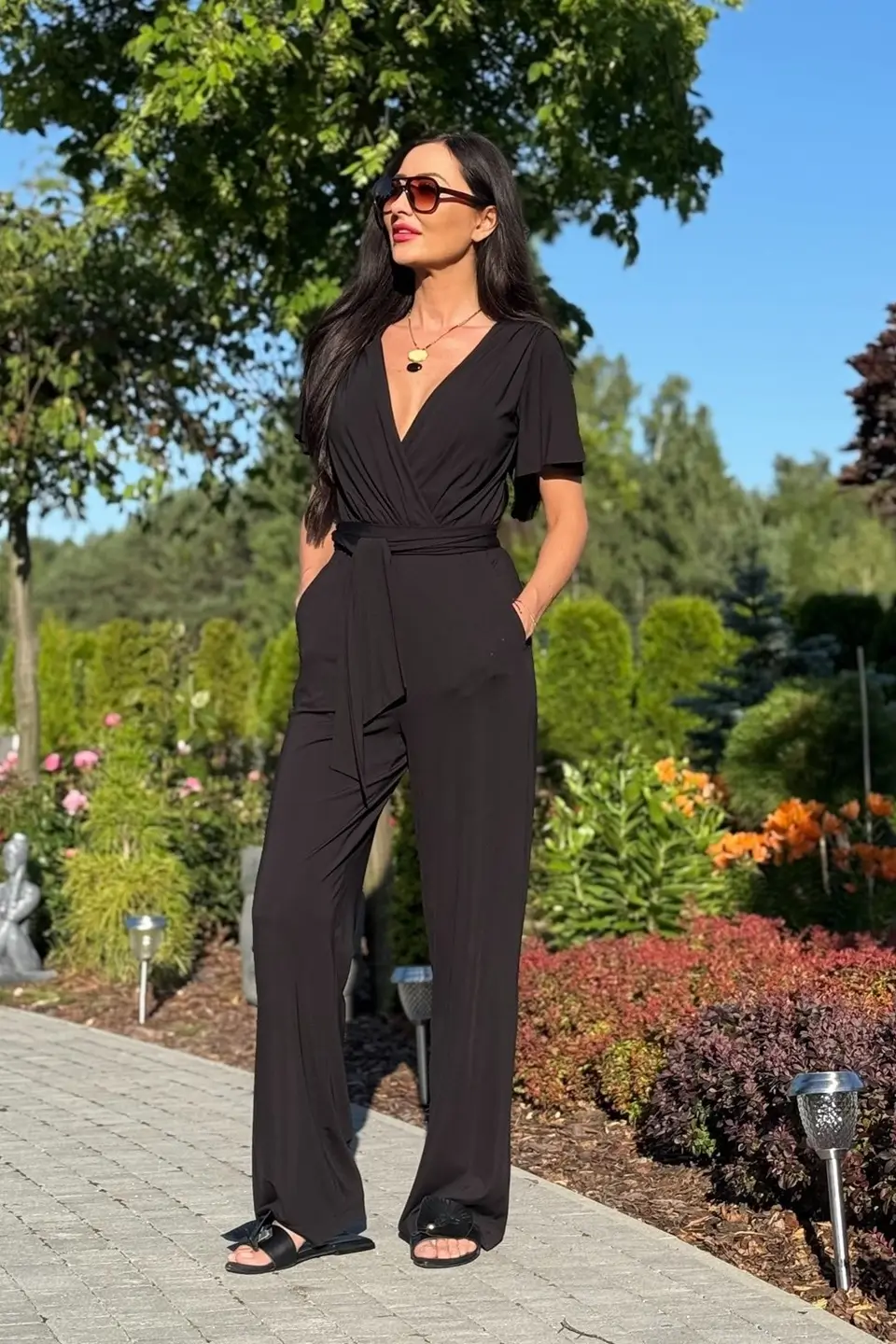 Fason kombinezonu został zaprojektowany z myślą o podkreśleniu atutów kobiecej sylwetki. Kopertowy dekolt optycznie wysmukla szyję i pięknie eksponuje biust, nadając stylizacji subtelnej elegancji. Delikatne, motylkowe rękawki dodają lekkości i romantycznego charakteru, a luźne nogawki zapewniają swobodę i komfort przez cały dzień. W talii znajduje się długi pasek, którym można przewiązać kombinezon, podkreślając kształty i modelując sylwetkę – to idealne rozwiązanie dla kobiet, które lubią wyglądać zgrabnie i stylowo bez nadmiernego wysiłku.