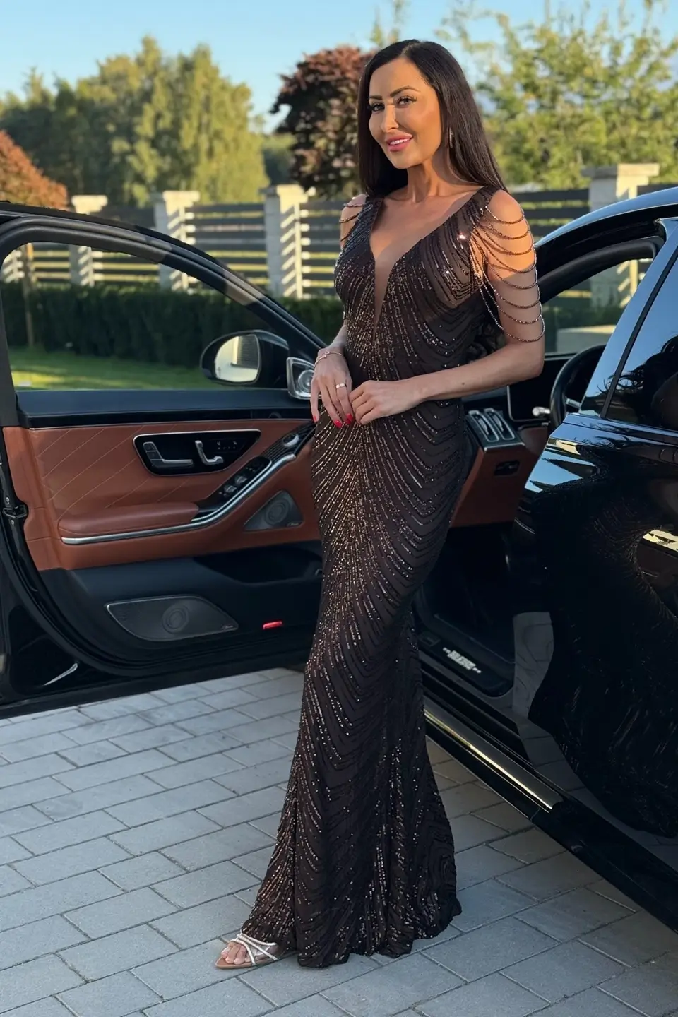 Ten model został okrzyknięty absolutnym hitem wśród sukienek wieczorowych – teraz dostępny w najbardziej pożądanym odcieniu sezonu, czyli głębokiej, szlachetnej czekoladzie. Kolor ten pięknie podkreśla urodę, dodaje klasy i pasuje do niemal każdego typu karnacji.