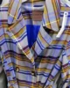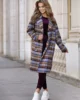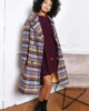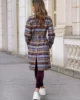 - Unikalny materiał: Wykonany z tkaniny w kratę, łączącej odcienie chabrowego, fioletu i musztardy, co sprawia, że płaszcz wyróżnia się nowoczesnym stylem, jednocześnie zachowując elegancję.