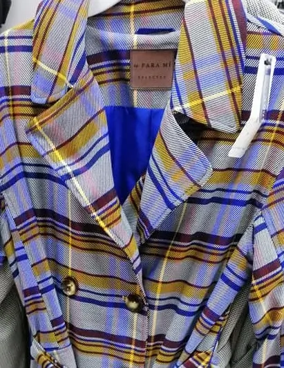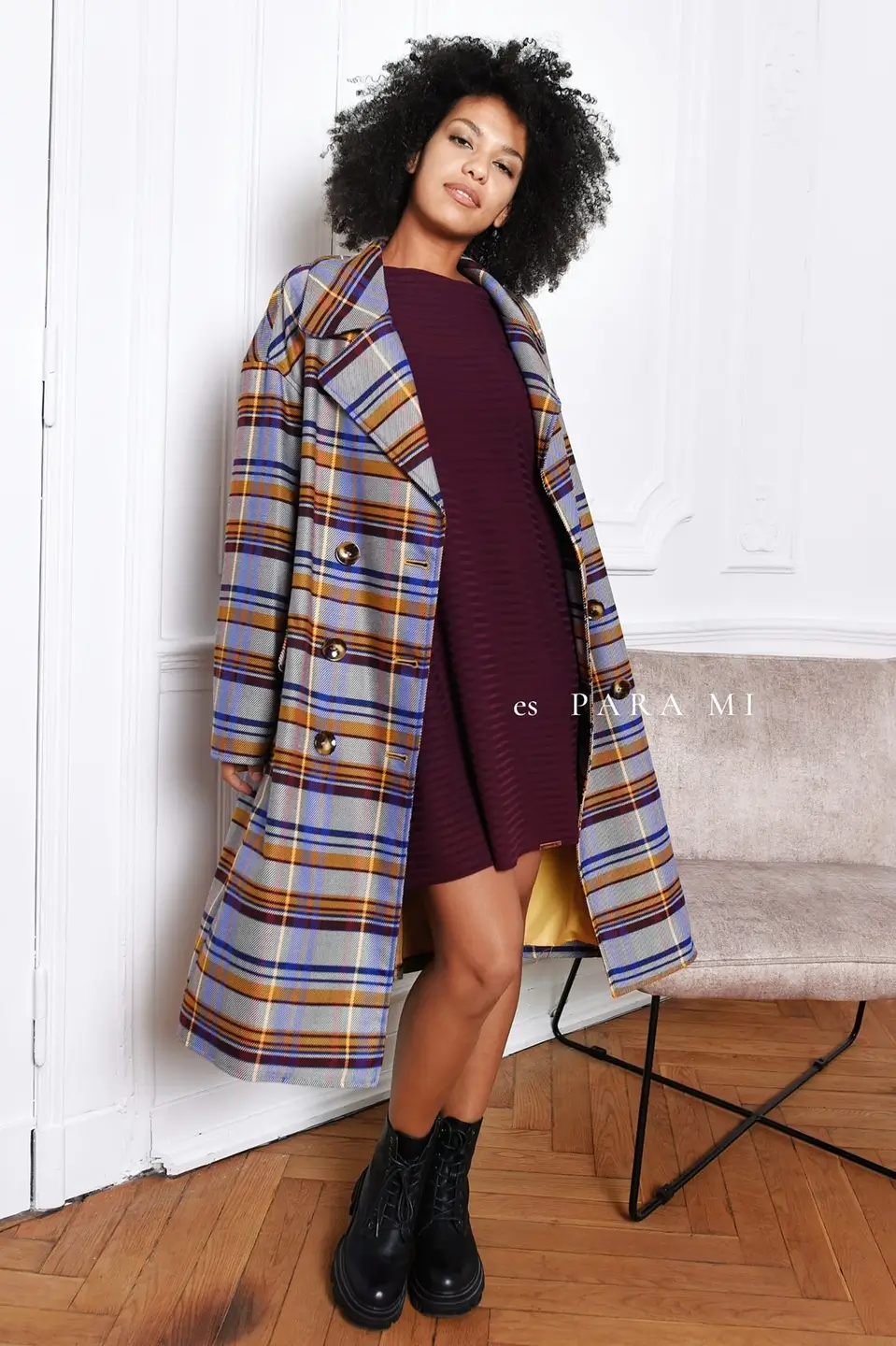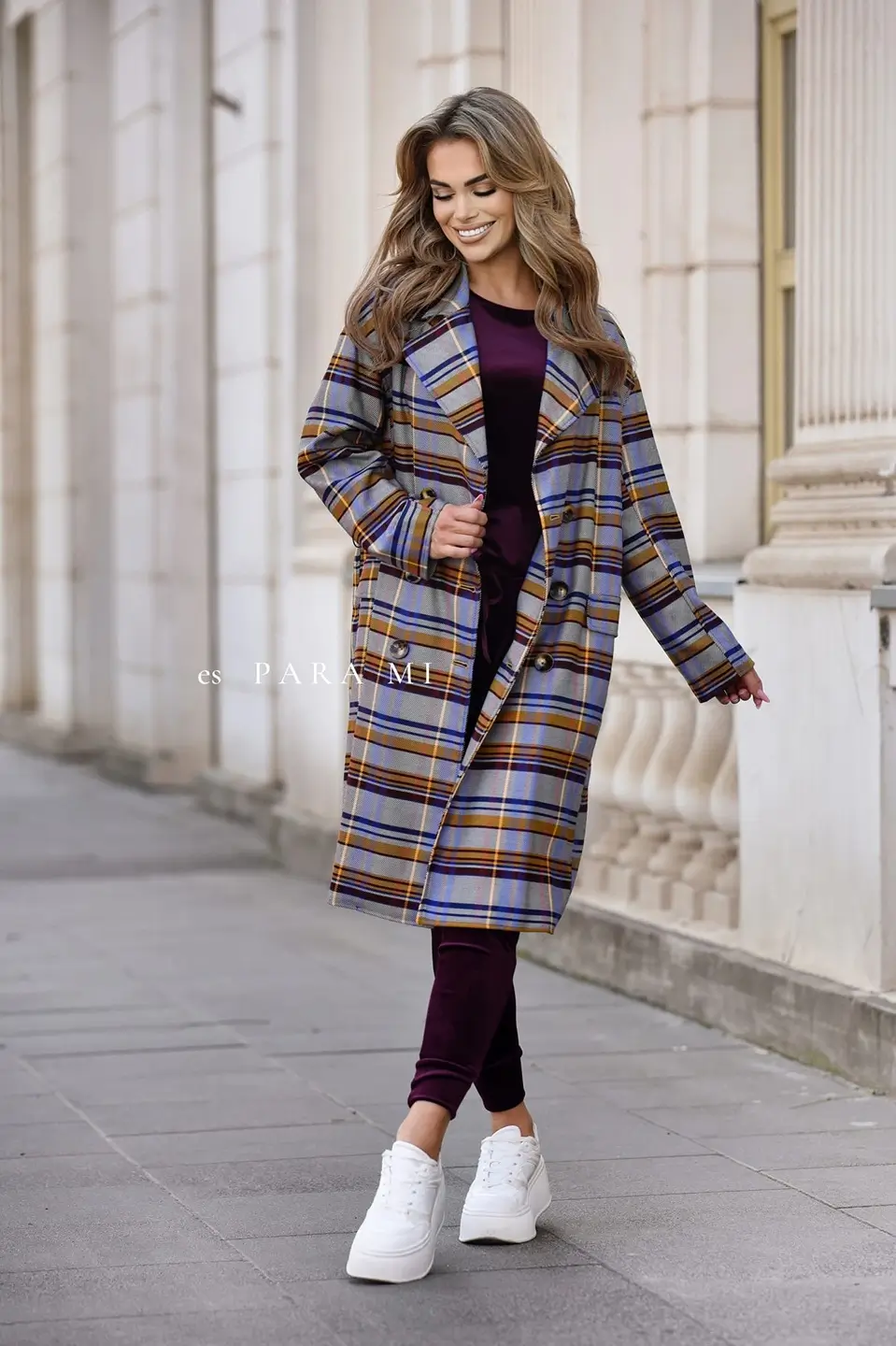 - Unikalny materiał: Wykonany z tkaniny w kratę, łączącej odcienie chabrowego, fioletu i musztardy, co sprawia, że płaszcz wyróżnia się nowoczesnym stylem, jednocześnie zachowując elegancję.