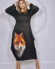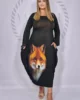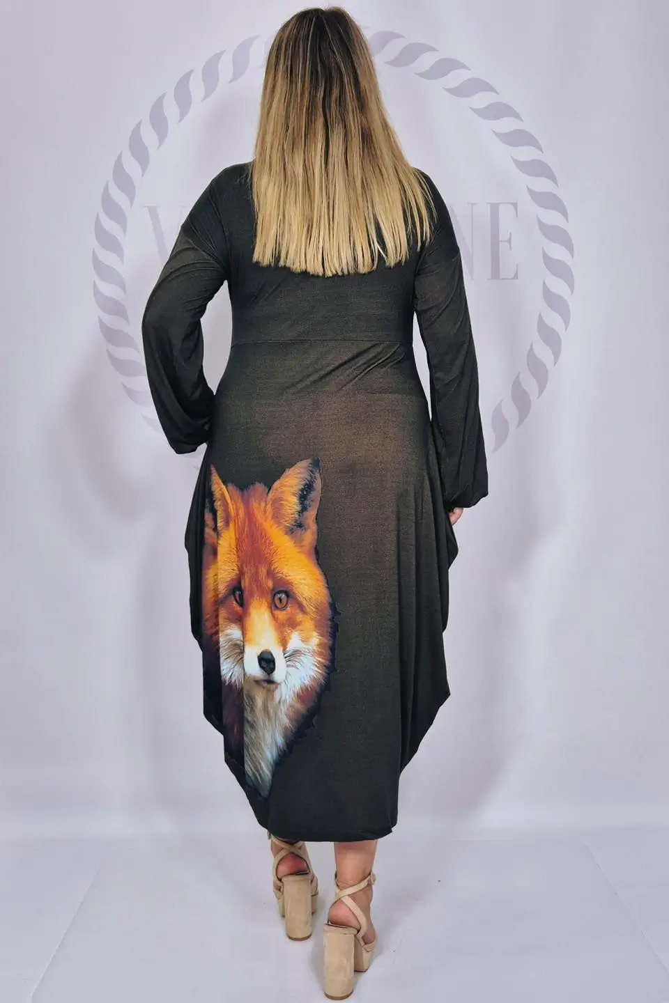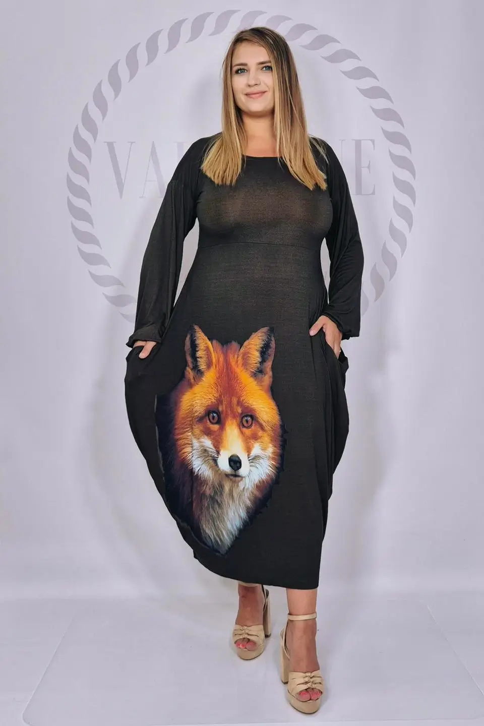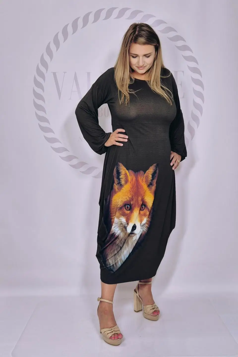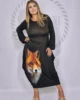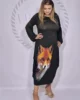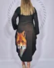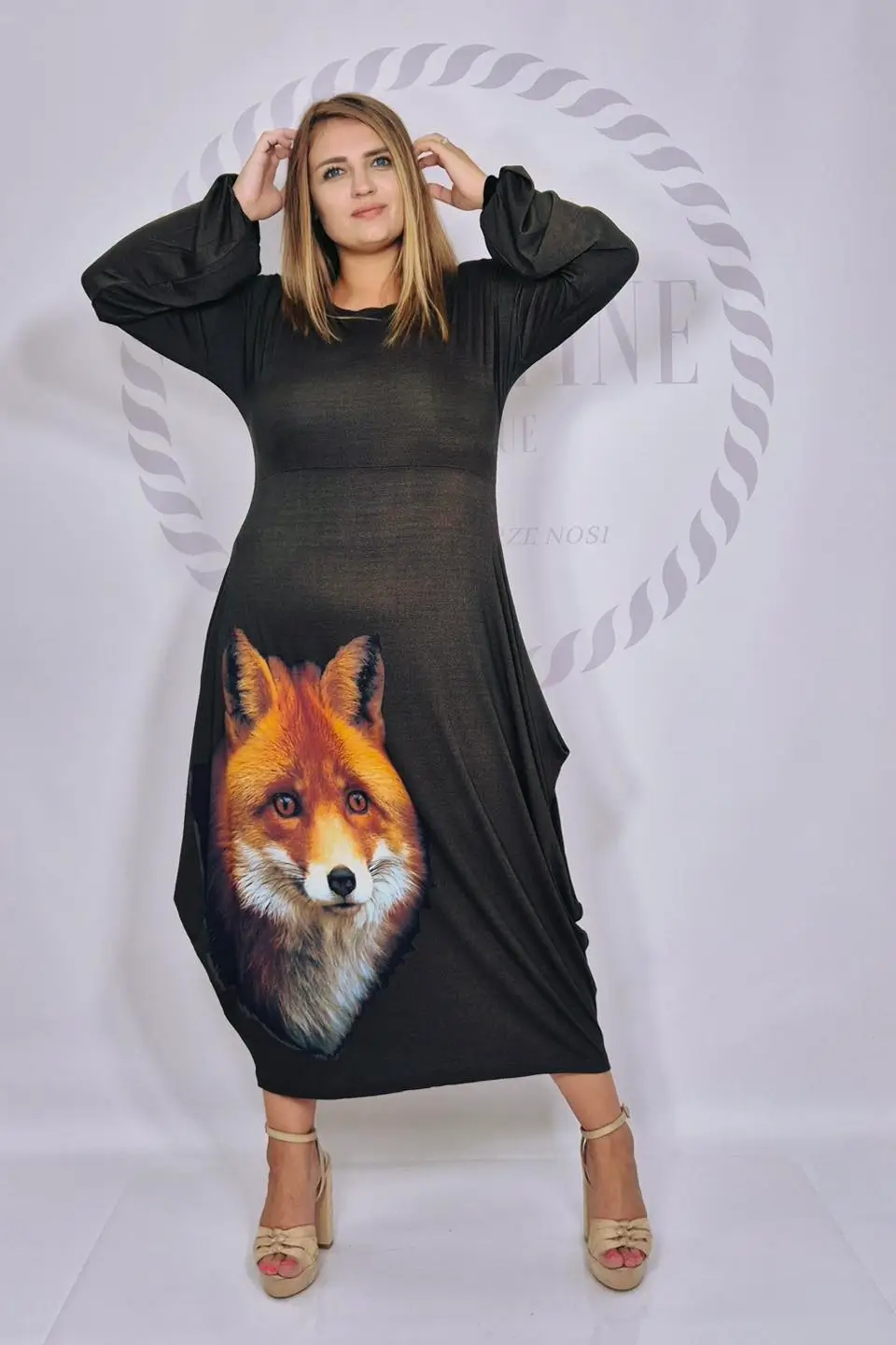 Dodatkowego uroku dodaje zjawiskowy nadruk w lisa, który sprawia, że kreacja przyciąga spojrzenia i staje się wyjątkowym elementem garderoby. Półokrągły dekolt pięknie eksponuje szyję, a szerokie rękawy zakończone gumką tworzą efekt delikatnych dzwoneczków, nadając całości lekkości i kobiecego wdzięku.