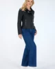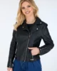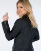 Krótka kurtka z eko skóry zasuwana na metalowy suwak z klasycznym kołnierzem z napami, zasuwana asymetrycznie na błyszczący, metalowy suwaki. Nieduży kołnierz ozdobiony błyszczącymi napami. Dopasowany przód z potrójnie stębnowanymi szwami. Dwie pionowe kieszenie boczne zasuwane na błyszczące zamki błyskawiczne. Na ramionach dodatkowe stębnowane wzmocnienia. Rękawy proste zakończone mankietami zasuwanymi na metalowe zamki błyskawiczne. W talii doszywany pasek ozdobiony podwójnymi szlufkami z błyszczącymi napami. Tył o koszulowym kroju z karczkiem. Wewnątrz miła w dotyku podszewka. Kurtka uszyta z miękkiej i lekkiej ekologicznej skóry.