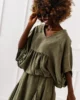 Bluzka w komplecie ma luźny fason, który świetnie dopasowuje się do różnych sylwetek. Gumka na dole nadaje formę i pozwala na dowolne układanie – możesz ją nosić jako oversize lub lekko „puszczoną” na biodra. Dekolt w kształcie litery V subtelnie wydłuża szyję i dodaje całości kobiecego uroku. Krótkie rękawy zakończone są ozdobnym marszczeniem, które podkreśla lekki, letni styl. To model, który świetnie wygląda zarówno jako element zestawu, jak i noszony oddzielnie – np. do jeansów czy szortów.