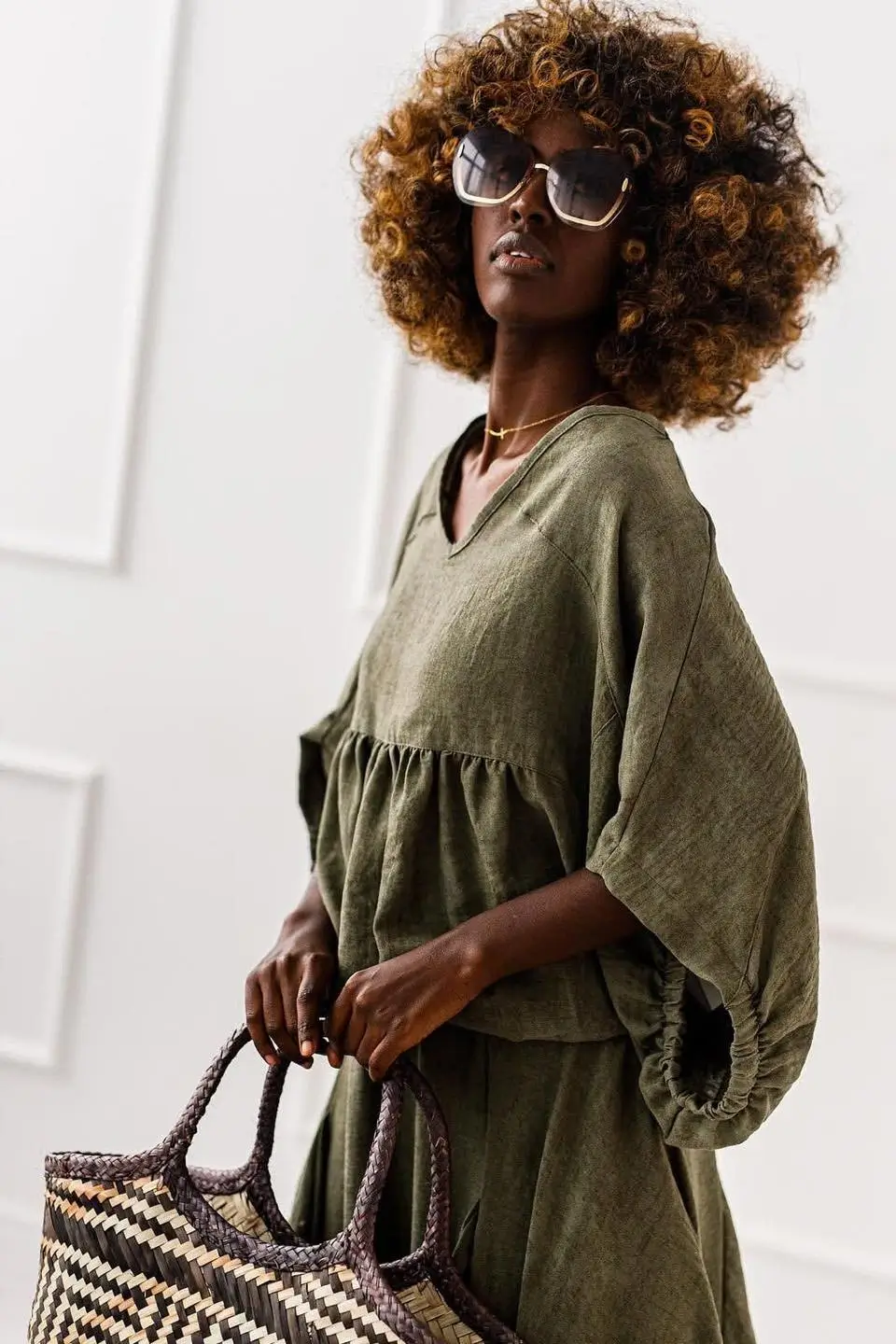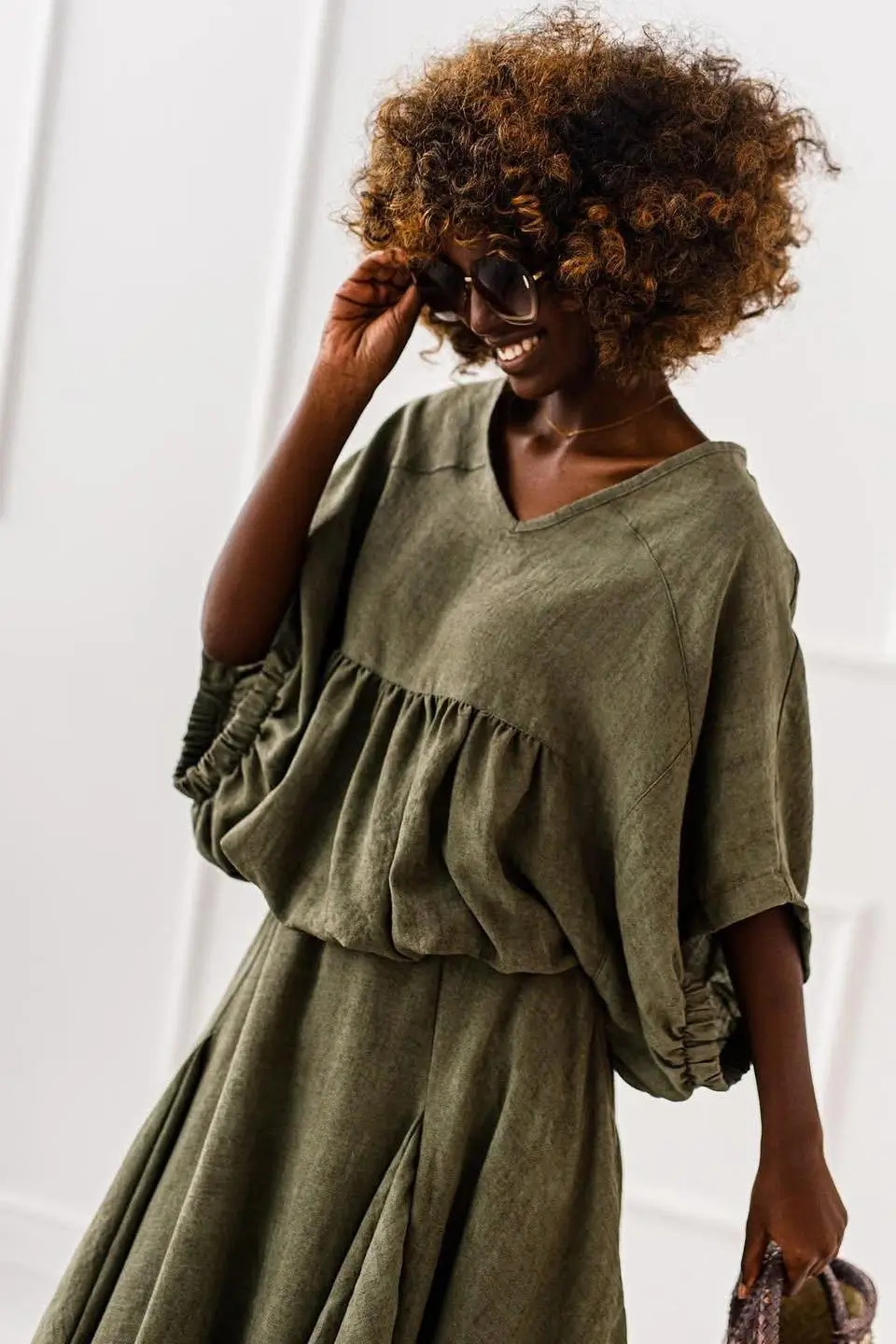 Komplet SUR to świetna propozycja dla kobiet w różnym wieku – jego luźny, ale przemyślany krój pasuje do wielu typów sylwetek. Zarówno bluzka, jak i spódnica nie krępują ruchów i pozwalają czuć się swobodnie przez cały dzień. Taki zestaw sprawdzi się na spacer, zakupy, letnie spotkanie z przyjaciółmi, ale również jako stylizacja wakacyjna czy na festiwal. Zestaw go ze skórzanymi rzymiankami, klapkami, dużym koszykiem i kapeluszem, by stworzyć modny, boho look.