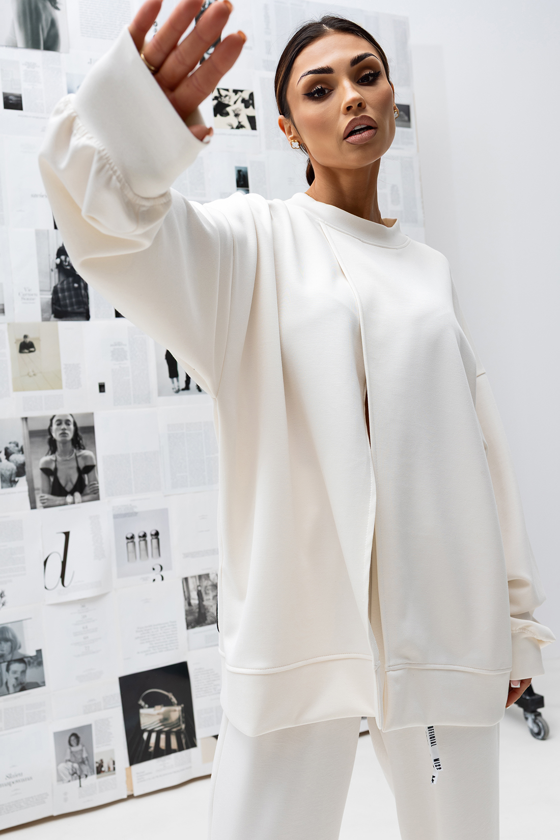 Nowoczesna bluza o luźnym, oversize’owym fasonie, zaprojektowana z myślą o komforcie i modnym, miejskim stylu. Jej charakterystycznym elementem jest asymetryczny przód, który nadaje całości oryginalnego, designerskiego wyglądu i sprawia, że model wyróżnia się na tle klasycznych bluz.
