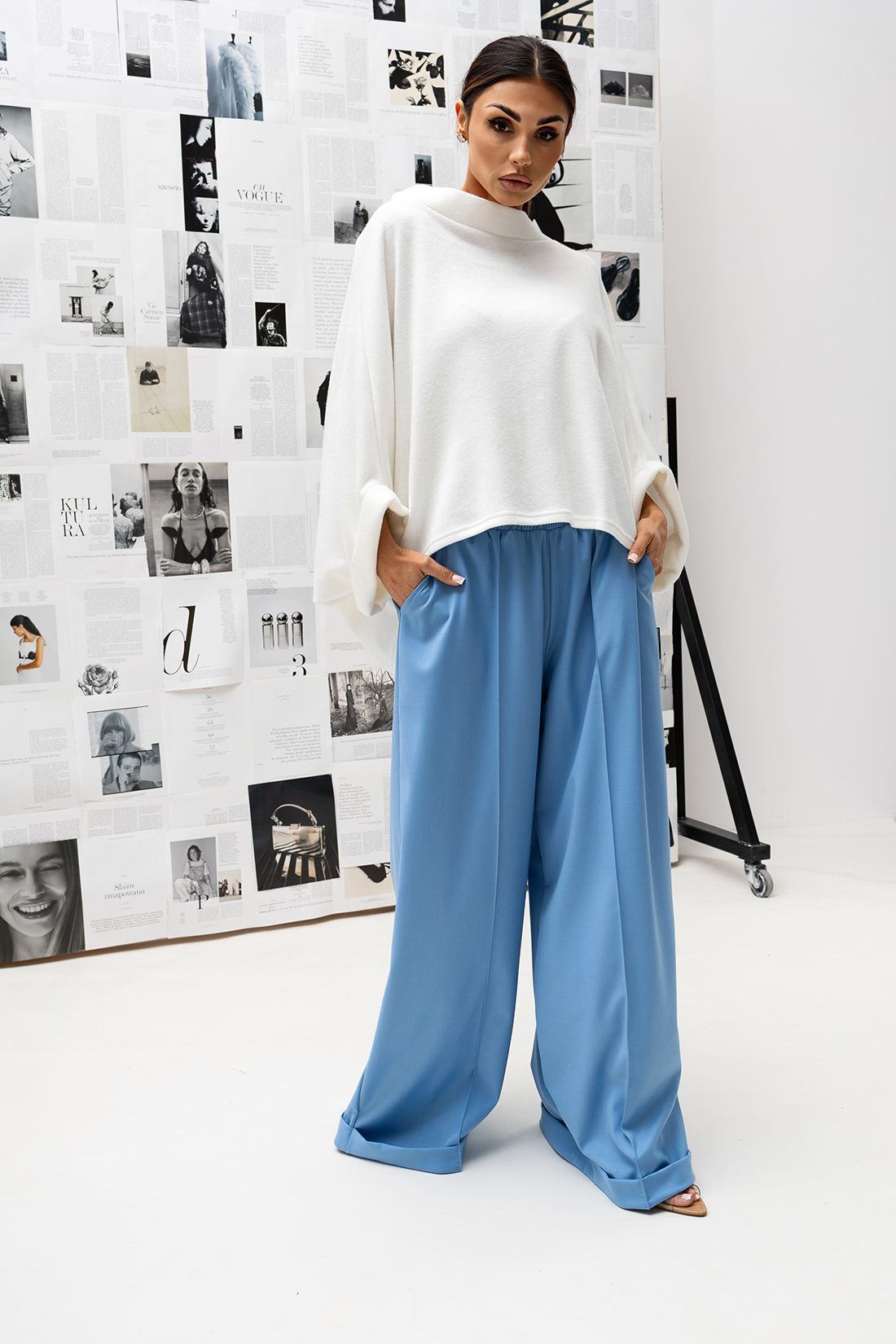 Całość została wykończona szeroką lamówką przy dekolcie i rękawach, co nadaje bluzce eleganckiego charakteru. To detale, które przyciągają uwagę i podkreślają jakość wykonania. Bluzka wygląda świetnie zarówno w wersji casualowej, jak i bardziej wyrafinowanej.