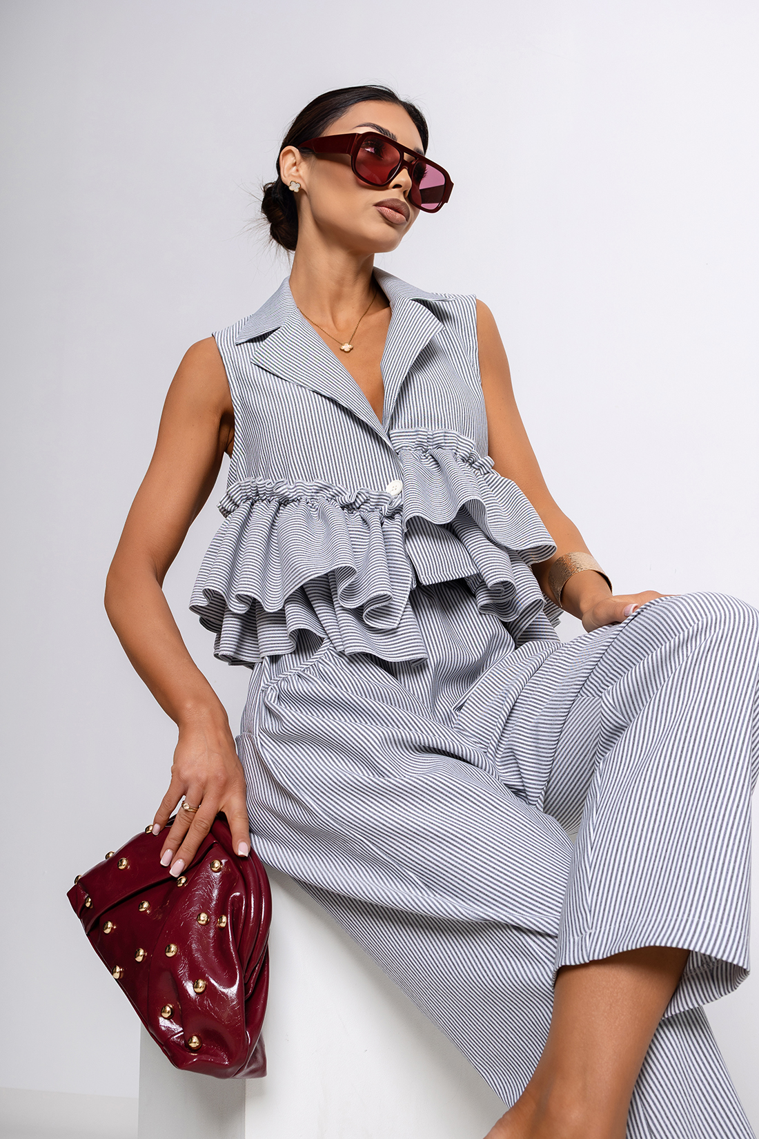 Model wyróżnia się eleganckim, koszulowym kołnierzem oraz subtelnym zapięciem na guziki, co nadaje mu lekko formalnego, ale wciąż bardzo kobiecego wyglądu. Bezrękawnikowy fason sprawia, że bluzka jest doskonałym wyborem na cieplejsze dni, zapewniając komfort i swobodę ruchów.