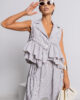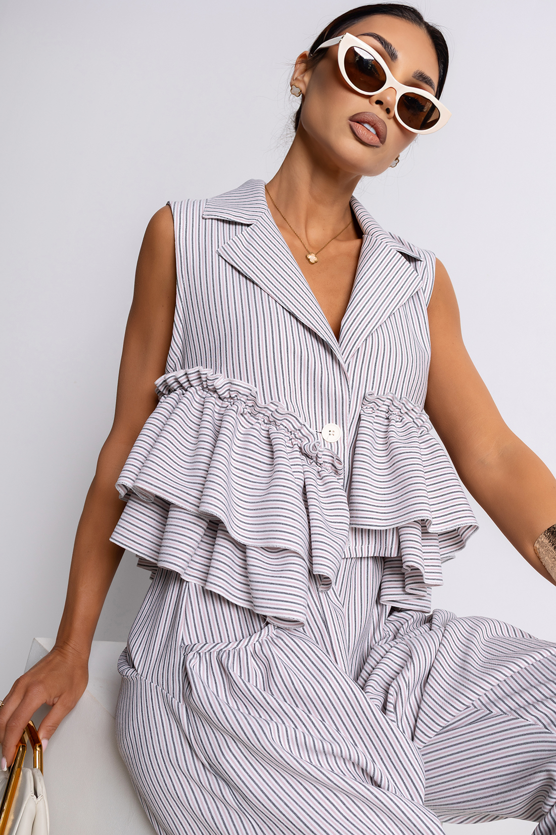 Największym atutem są efektowne falbany umieszczone na wysokości talii, które tworzą delikatną, rozkloszowaną formę. Ten detal pięknie podkreśla sylwetkę, dodając jej lekkości i dziewczęcego uroku. Pionowe paski w stonowanej kolorystyce – połączenie bieli, różu i szarości – optycznie wysmuklają figurę i nadają całości nowoczesnego charakteru.
