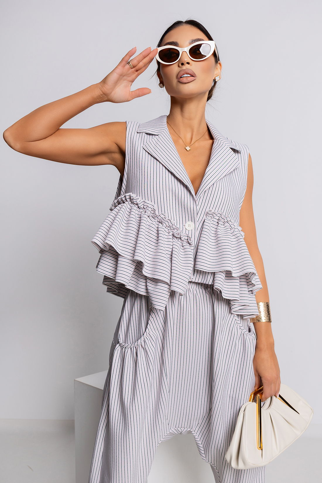 Ta wyjątkowa bluzka to idealne połączenie nowoczesnej formy z romantycznymi detalami, które przyciągają wzrok i nadają stylizacji niepowtarzalnego charakteru.