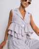 Model wyróżnia się eleganckim, koszulowym kołnierzem oraz subtelnym zapięciem na guziki, co nadaje mu lekko formalnego, ale wciąż bardzo kobiecego wyglądu. Bezrękawnikowy fason sprawia, że bluzka jest doskonałym wyborem na cieplejsze dni, zapewniając komfort i swobodę ruchów.