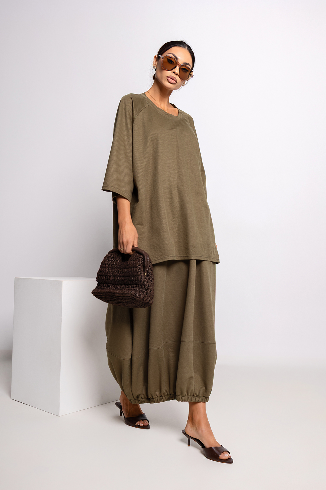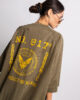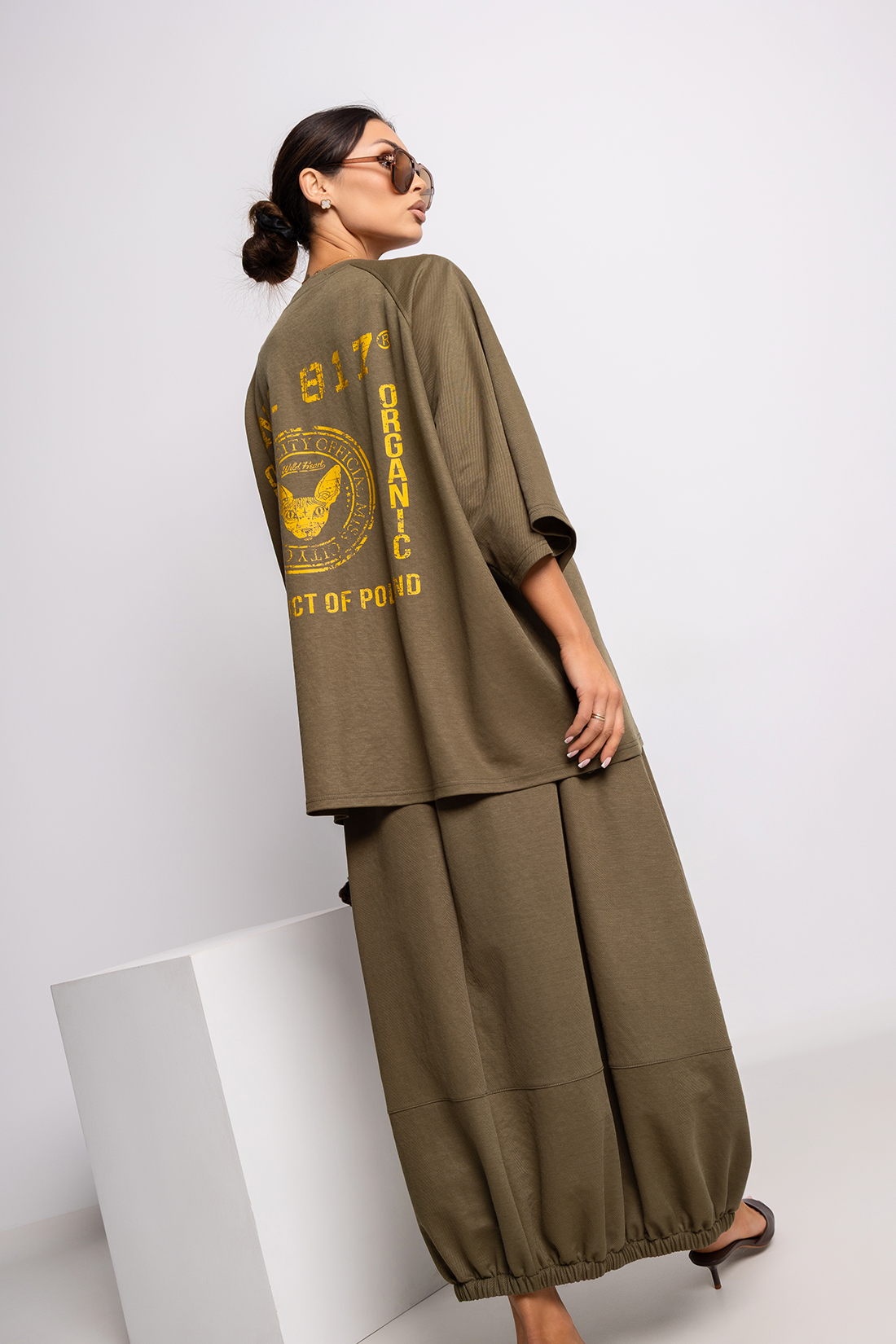 Luźny fason sprawia, że bluzka doskonale układa się na sylwetce i gwarantuje wygodę przez cały dzień. Dekolt w łódke subtelnie podkreśla szyję, dodając całości kobiecego akcentu, a minimalistyczna forma przełamana jest charakterystycznymi napisami nawiązującymi do stylu militarnego.
