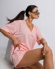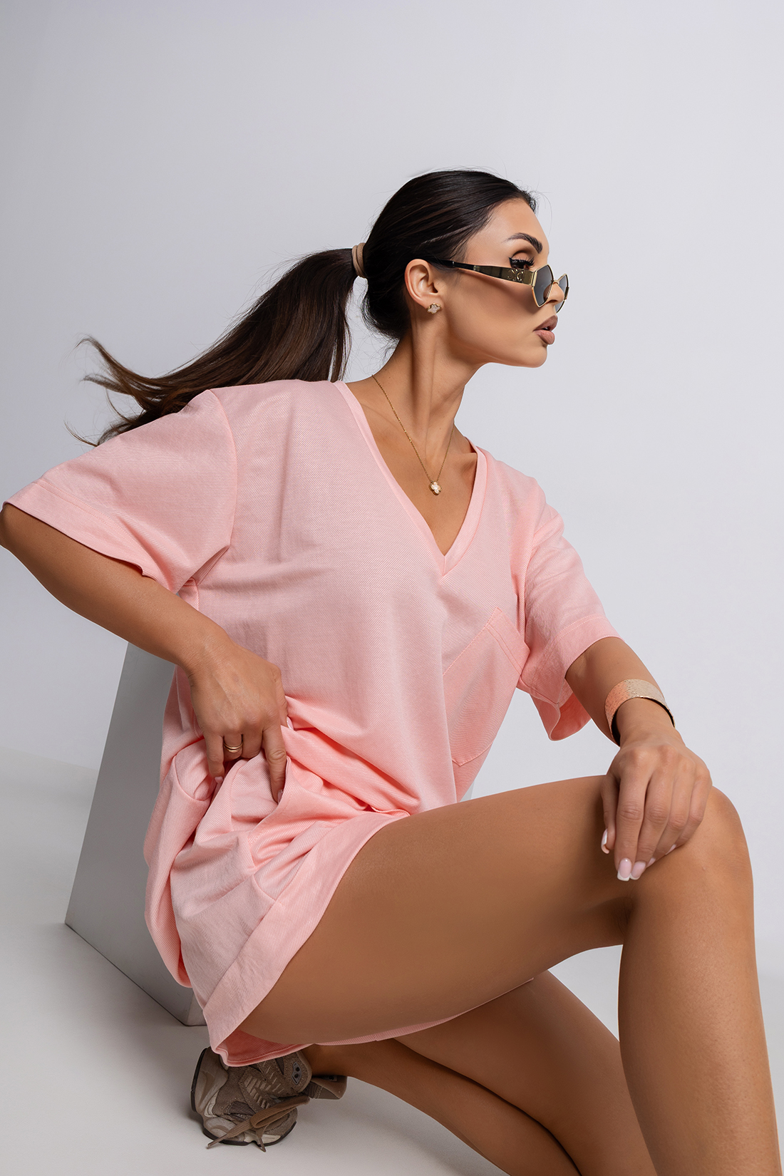Luźny fason sprawia, że bluzka doskonale układa się na sylwetce i gwarantuje wygodę przez cały dzień. Dekolt w kształcie litery V subtelnie podkreśla szyję, dodając całości kobiecego akcentu, a minimalistyczna forma przełamana jest charakterystycznymi napisami nawiązującymi do stylu militarnego.