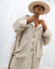 Model wyróżnia się klasycznym kołnierzykiem oraz zapięciem na guziki w dopasowanym odcieniu, co podkreśla jego spójną i dopracowaną formę. Obniżona linia ramion oraz szerokie, wydłużone rękawy nadają koszuli modnego, nonszalanckiego wyglądu, jednocześnie zapewniając pełną swobodę ruchów. Duże, naszywane kieszenie z przodu stanowią praktyczny element, który przełamuje klasyczny fason i dodaje całości wyrazistości.
