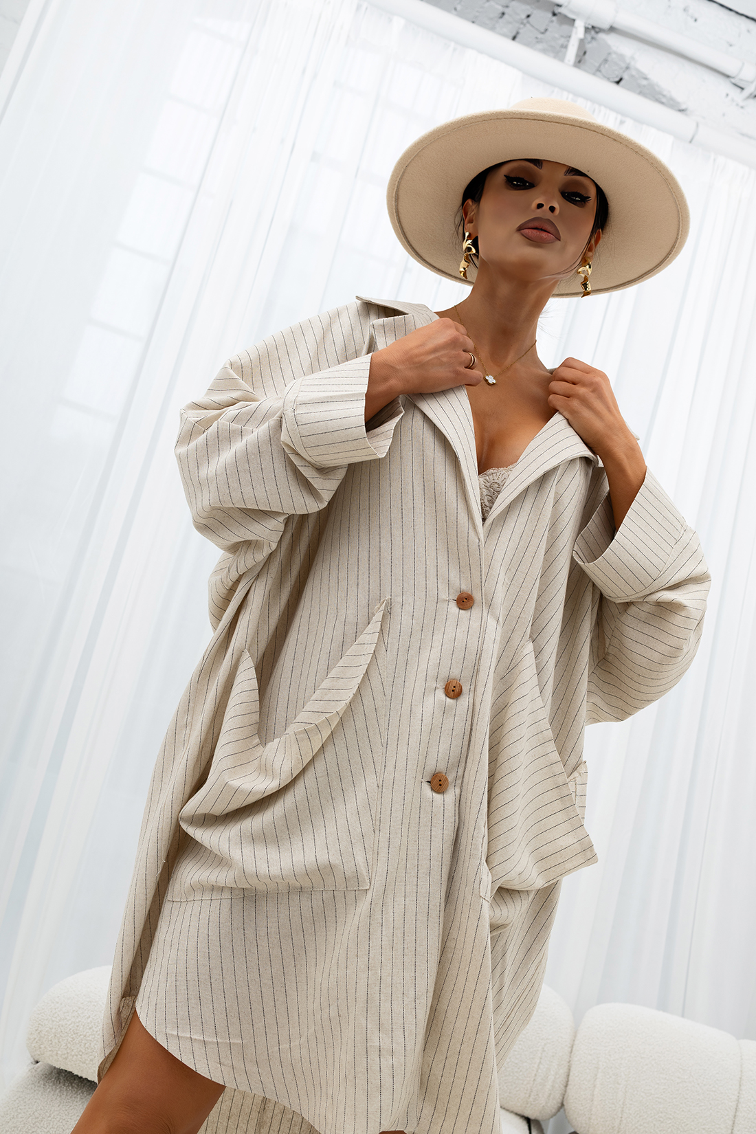 Koszula o efektownym, oversize’owym kroju, zaprojektowana z myślą o kobietach ceniących nowoczesny styl i swobodę. Wykonana z lekkiego, miękko układającego się materiału, zapewnia wysoki komfort noszenia oraz przewiewność, dzięki czemu sprawdzi się o każdej porze roku. Tkanina zdobiona jest subtelnym, pionowym prążkiem, który optycznie wysmukla sylwetkę i dodaje całości eleganckiego charakteru.