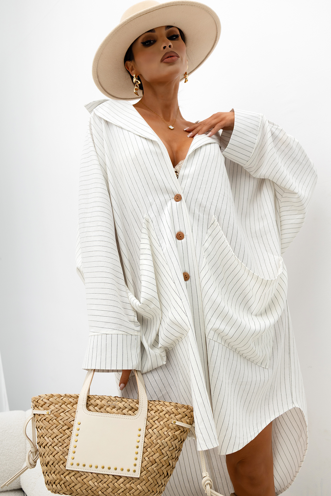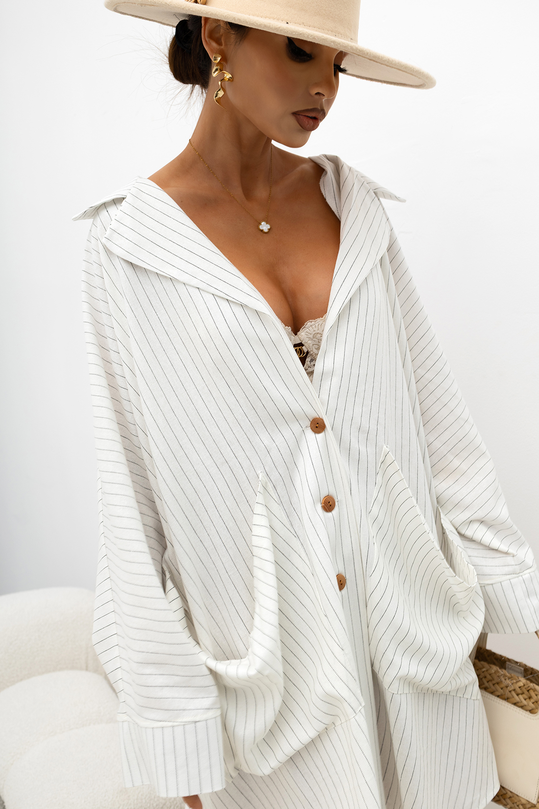 Koszula o efektownym, oversize’owym kroju, zaprojektowana z myślą o kobietach ceniących nowoczesny styl i swobodę. Wykonana z lekkiego, miękko układającego się materiału, zapewnia wysoki komfort noszenia oraz przewiewność, dzięki czemu sprawdzi się o każdej porze roku. Tkanina zdobiona jest subtelnym, pionowym prążkiem, który optycznie wysmukla sylwetkę i dodaje całości eleganckiego charakteru.