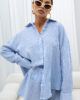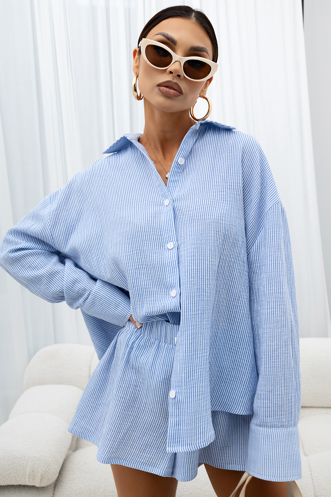 Model posiada klasyczny kołnierzyk oraz zapięcie na guziki, co nadaje mu ponadczasowej elegancji. Niebiesko-biały, pionowy prążek optycznie wysmukla sylwetkę i dodaje stylizacji świeżości oraz lekkości. Obniżona linia ramion oraz szerokie, długie rękawy podkreślają nowoczesny, swobodny charakter koszuli.