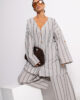 Całość utrzymana jest w subtelnym, pionowym prążku, który nie tylko dodaje jej elegancji, ale również optycznie wysmukla sylwetkę i wydłuża proporcje ciała. Stonowana kolorystyka sprawia, że koszula jest niezwykle łatwa do stylizowania – pasuje zarówno do klasycznych, jak i bardziej nowoczesnych zestawów.