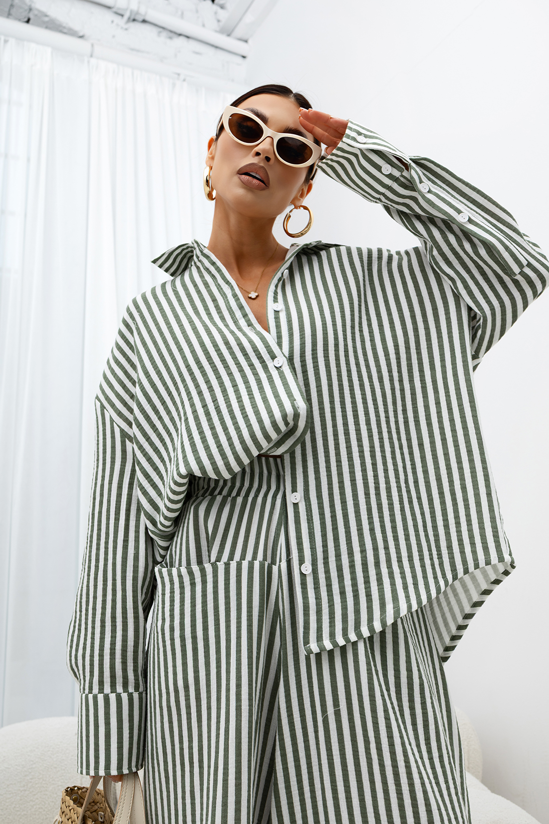 Model posiada klasyczny kołnierzyk oraz zapięcie na guziki, co nadaje mu ponadczasowej elegancji. Niebiesko-biały, pionowy prążek optycznie wysmukla sylwetkę i dodaje stylizacji świeżości oraz lekkości. Obniżona linia ramion oraz szerokie, długie rękawy podkreślają nowoczesny, swobodny charakter koszuli.