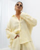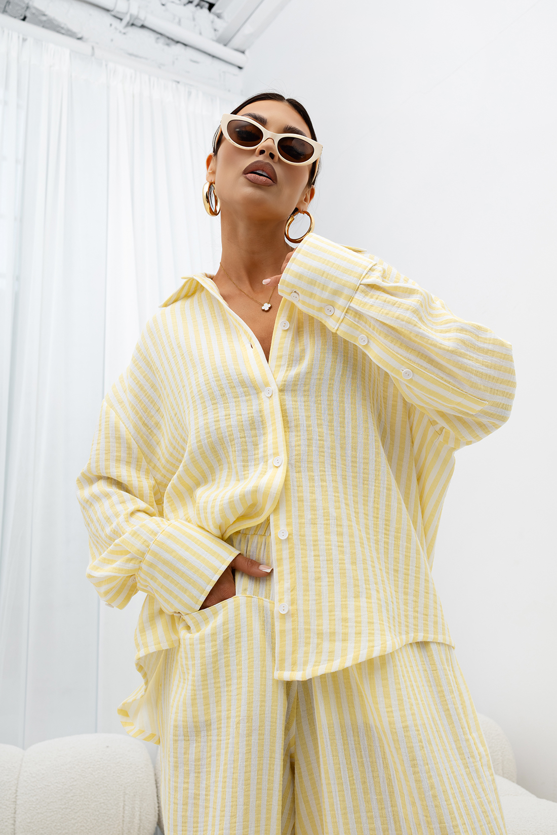 Koszula o modnym, oversize’owym kroju, zaprojektowana z myślą o maksymalnej wygodzie i stylowym, niewymuszonym wyglądzie. Wykonana z lekkiej, przewiewnej tkaniny, która przyjemnie układa się na sylwetce i zapewnia komfort noszenia nawet w cieplejsze dni. To idealna propozycja na sezon wiosenno-letni.