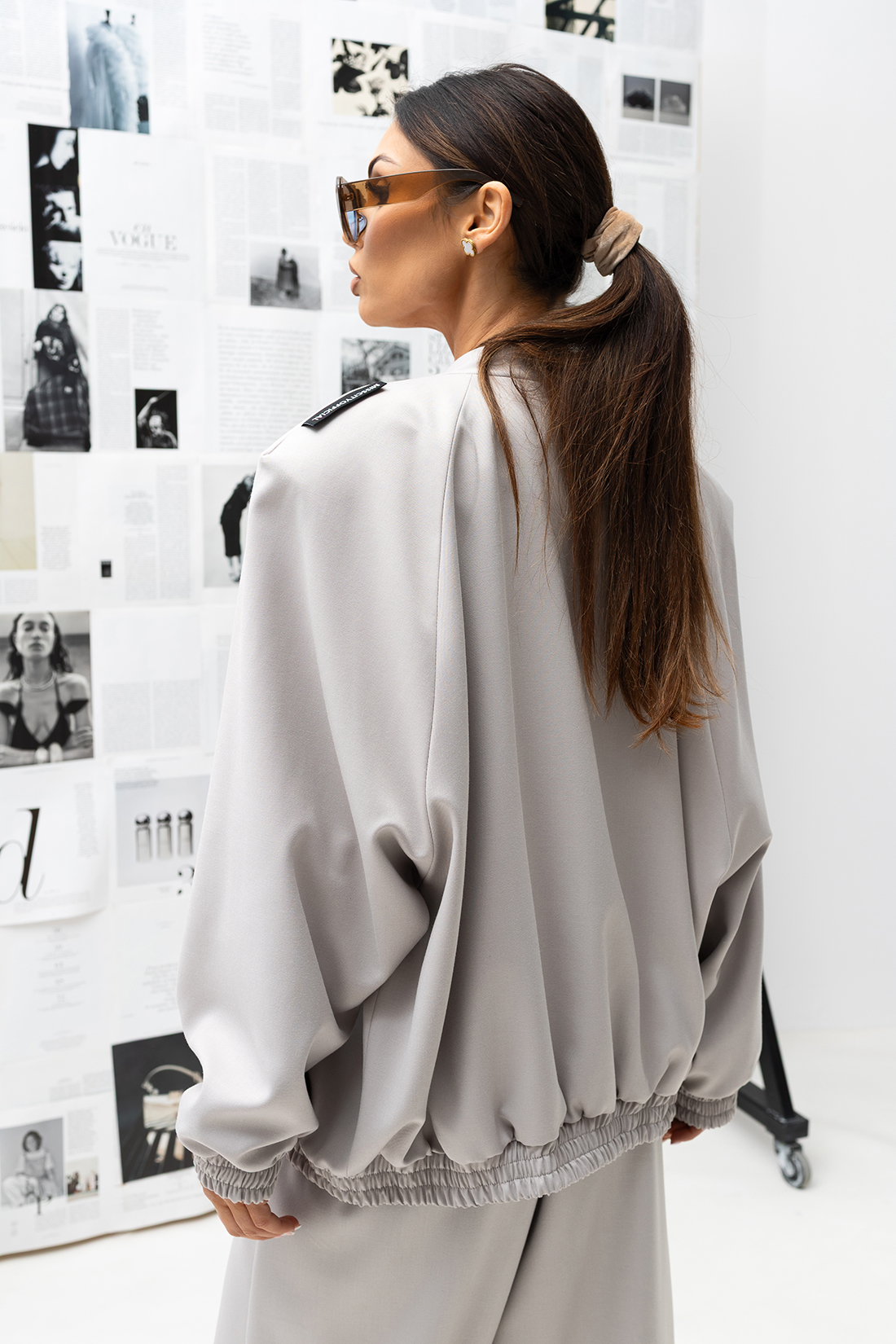 Kurtka zapinana jest na suwak, co pozwala nosić ją zarówno w formie klasycznie zapiętej, jak i lekko rozpiętej – tworząc stylowy, warstwowy efekt. Elastyczne ściągacze przy rękawach oraz na dole podkreślają fason bomberki, delikatnie modelując sylwetkę i zapobiegając podwiewaniu materiału. Gładka, matowa tkanina o lekko technicznym wykończeniu nadaje całości eleganckiego, nowoczesnego charakteru, a jednocześnie jest przyjemna w dotyku i praktyczna w codziennym użytkowaniu.