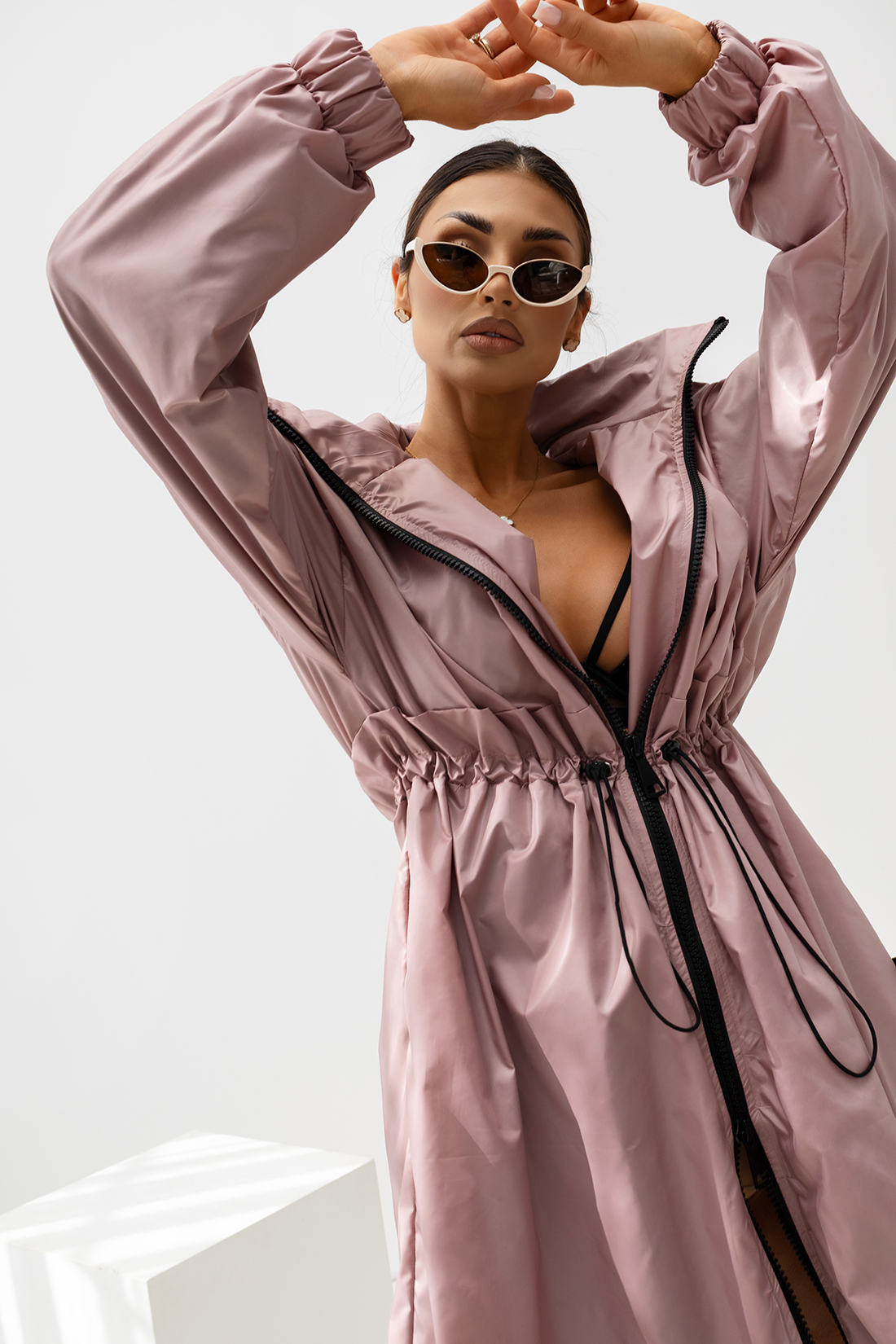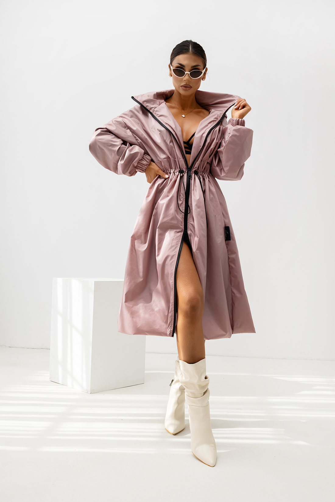 Kurtka posiada wygodny zamek błyskawiczny na całej długości, który ułatwia szybkie zakładanie i zdejmowanie. Charakterystycznym elementem modelu jest regulacja w talii w postaci ściągacza ze sznurkiem. Pozwala ona dopasować kurtkę do sylwetki, podkreślając kobiece kształty i jednocześnie zapewniając komfort noszenia. Dzięki temu kurtka może mieć zarówno bardziej luźny, sportowy charakter, jak i dopasowany, elegancki wygląd.
