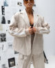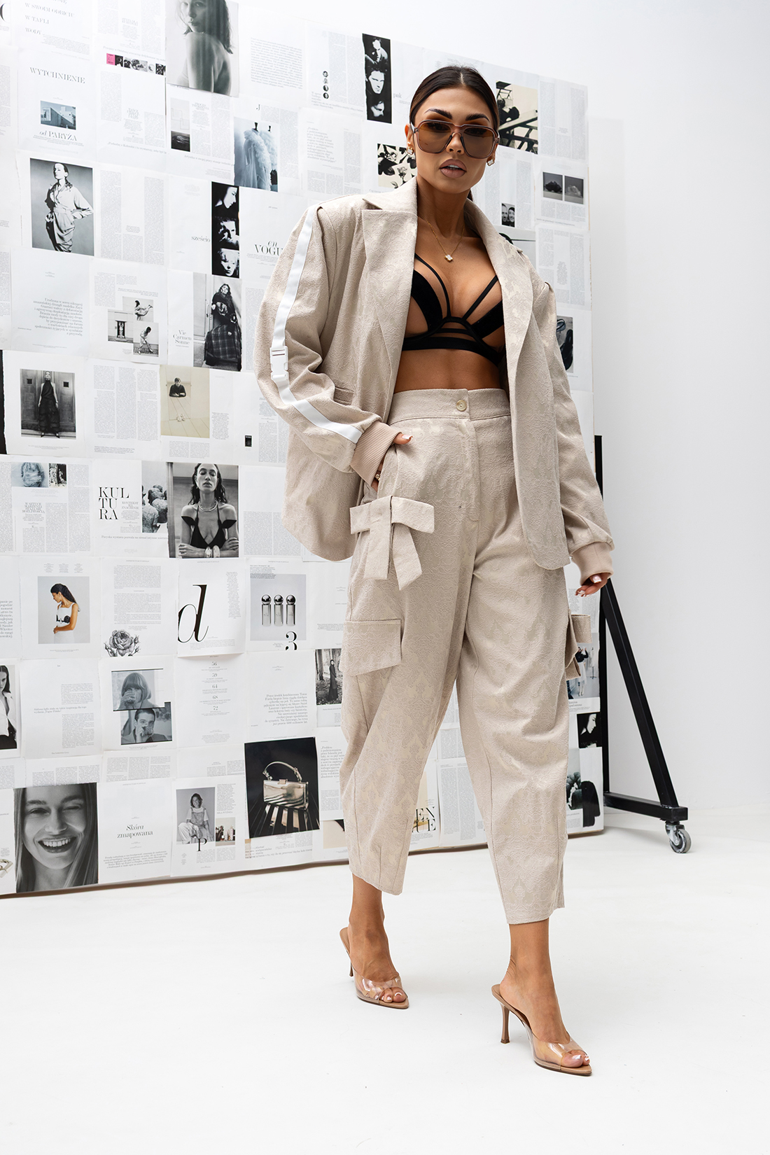 Marynarka została wykończona efektownymi czarnymi taśmami, które podkreślają linię kroju i dodają całości mocnego, designerskiego akcentu. Stylowe klipsy na rękawach pełnią funkcję dekoracyjną i pozwalają nadać rękawom bardziej strukturalny wygląd.