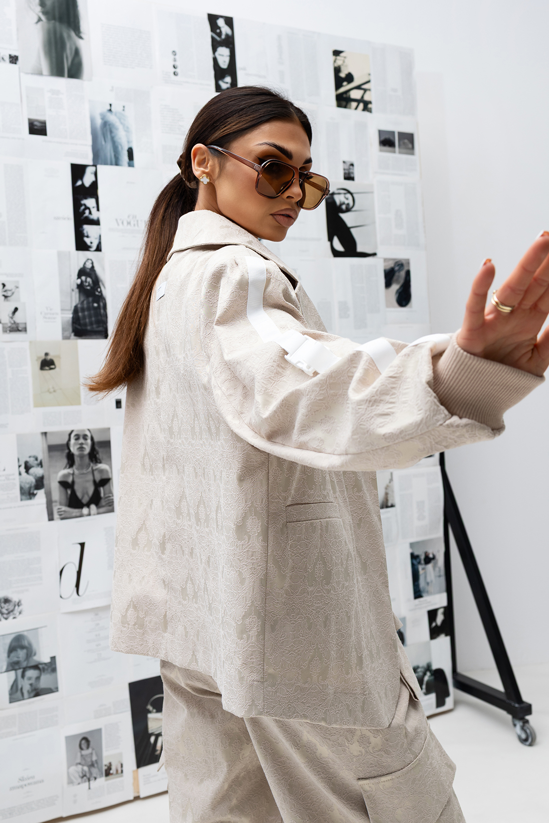 Wykonana z grubego żakardu, który nadaje marynarce strukturę i formę, wyróżnia się modnym efektem klejonej koronki – jednym z najmocniejszych trendów tego sezonu. To model, który przyciąga spojrzenia i buduje stylizację bez wysiłku.