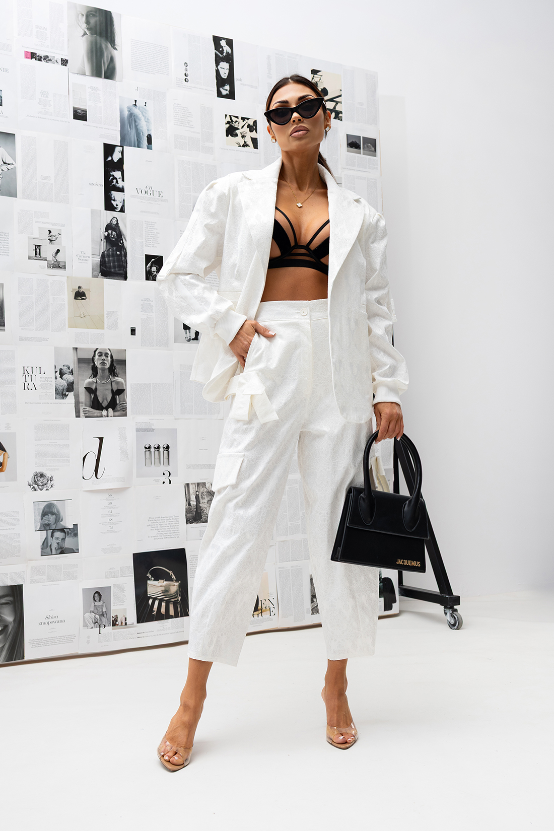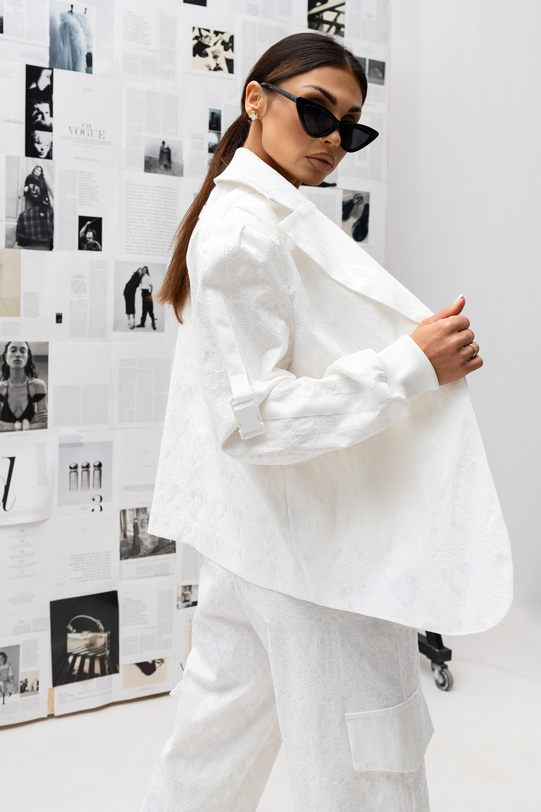 Wykonana z grubego żakardu, który nadaje marynarce strukturę i formę, wyróżnia się modnym efektem klejonej koronki – jednym z najmocniejszych trendów tego sezonu. To model, który przyciąga spojrzenia i buduje stylizację bez wysiłku.
