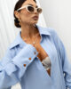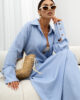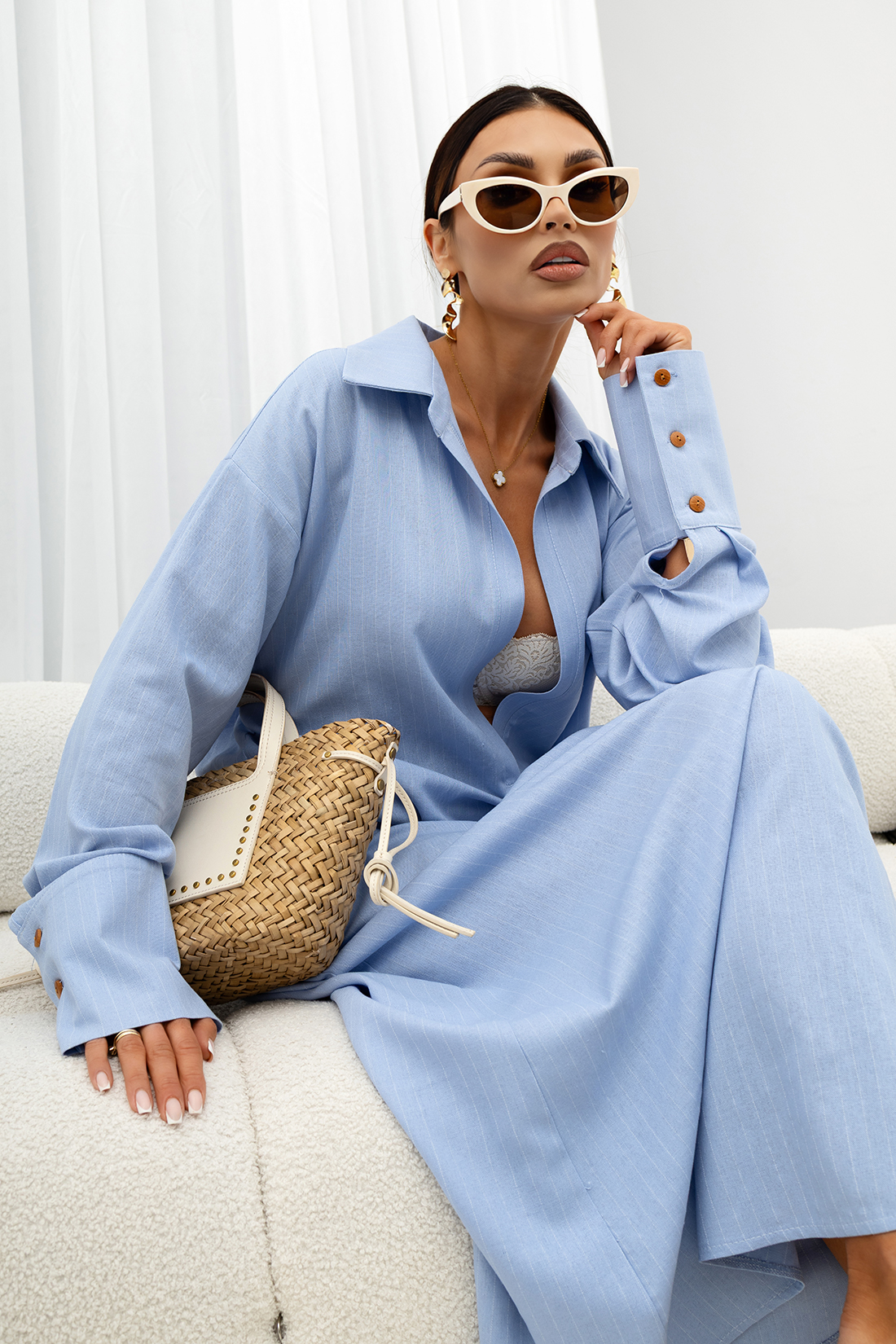 Model posiada klasyczny kołnierzyk oraz dekolt w kształcie litery V, który pięknie eksponuje szyję i dodaje lekkości całej stylizacji. Obniżona linia ramion oraz luźny fason zapewniają swobodę ruchów, a jednocześnie wpisują się w aktualne trendy. Długie rękawy zakończone szerokimi mankietami z ozdobnymi guzikami stanowią elegancki, dopracowany detal.