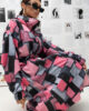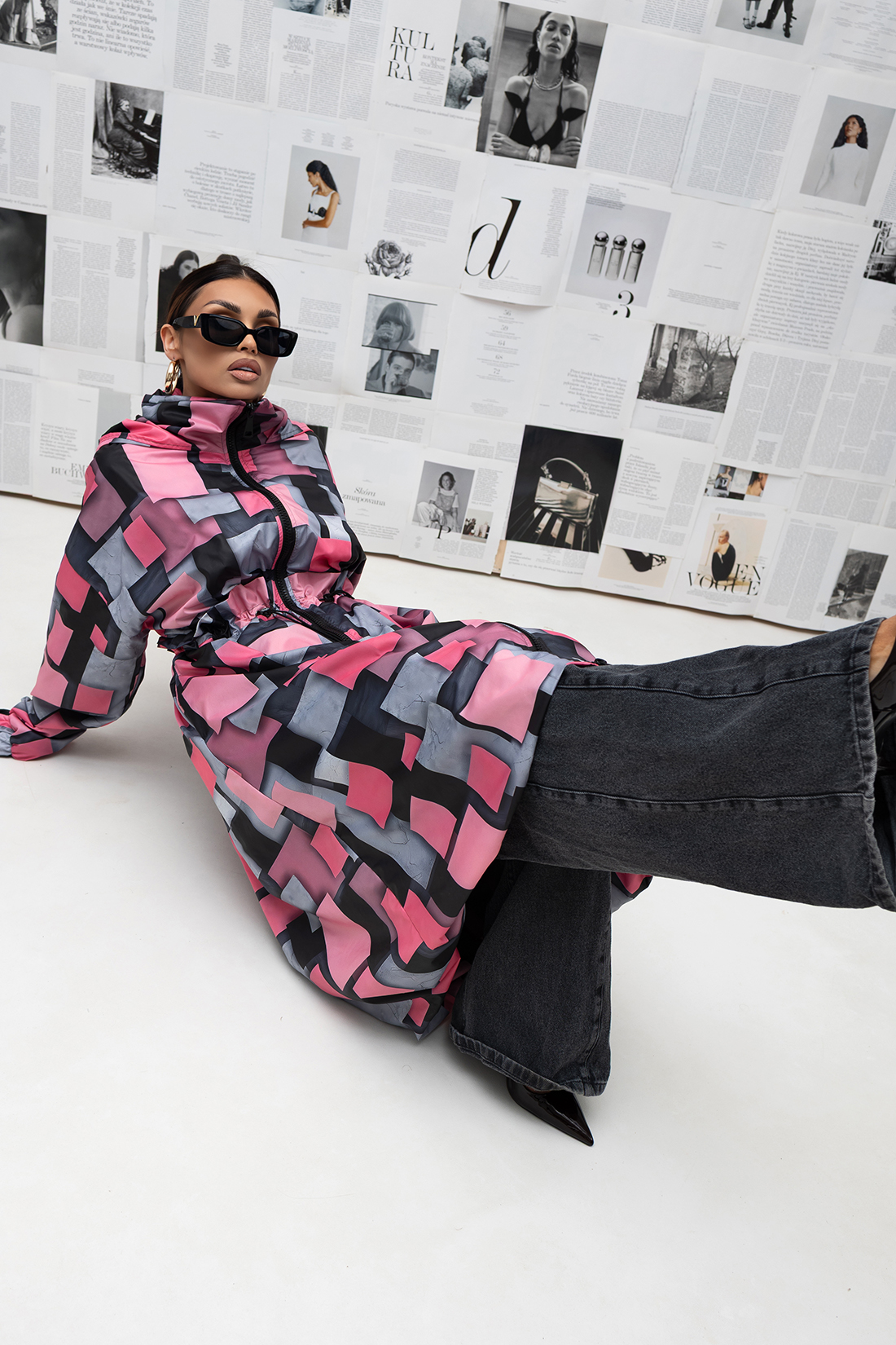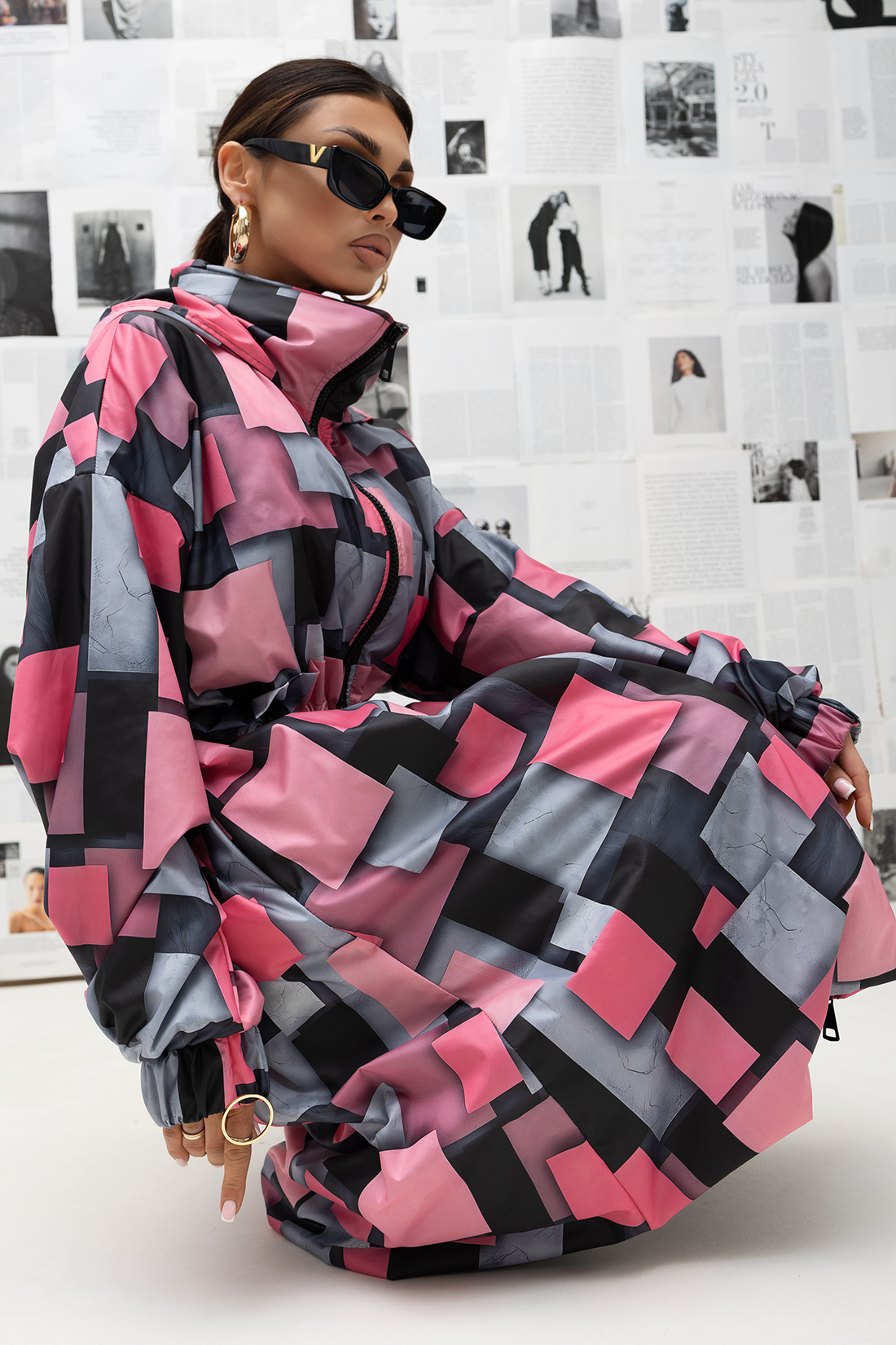 Geometryczny patchwork w odcieniach różu, szarości i czerni nadaje całości artystycznego charakteru, który podkreśli indywidualność i kreatywność noszącej. To modowy statement, który doskonale wpisuje się w ducha współczesnej mody miejskiej i premium.
