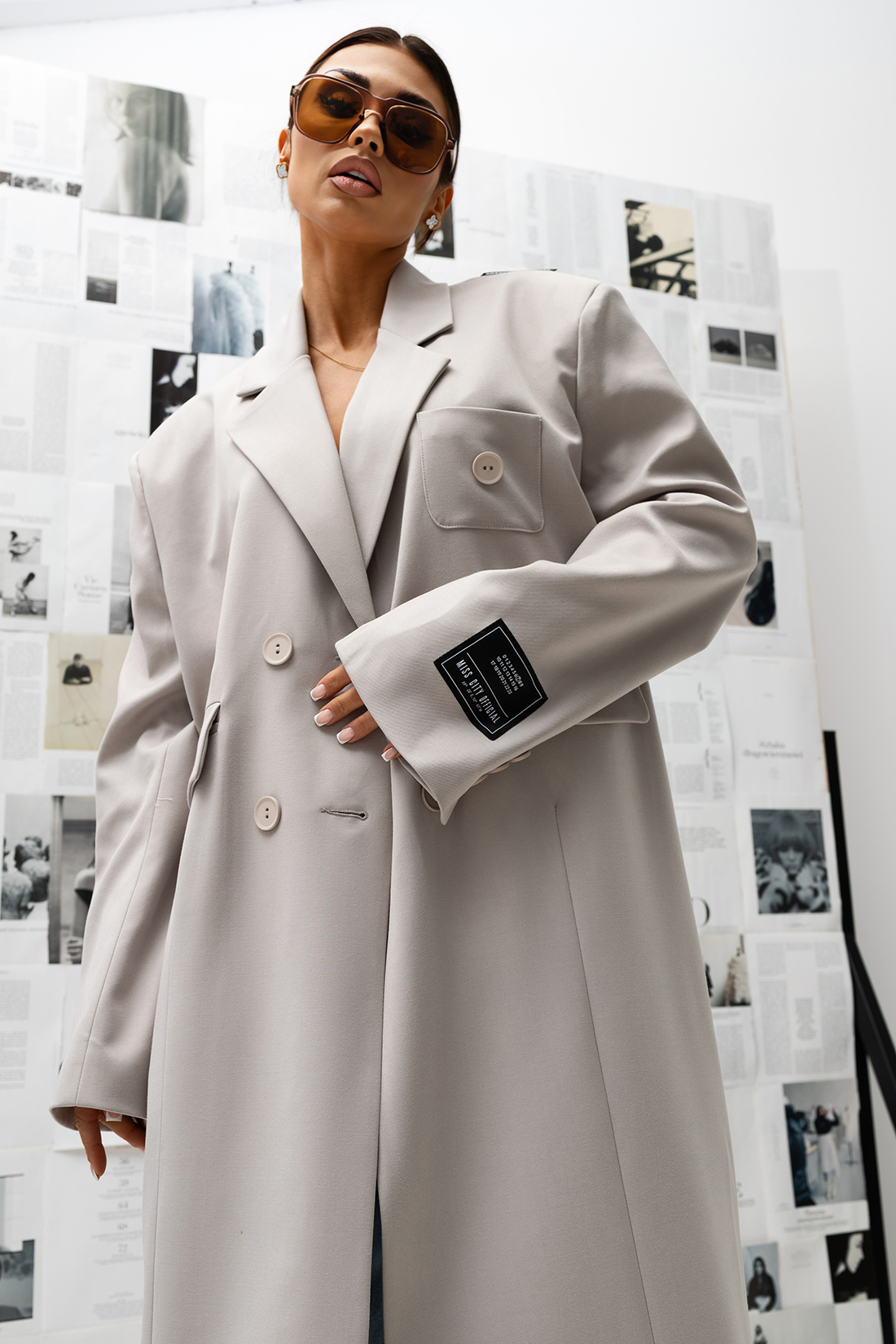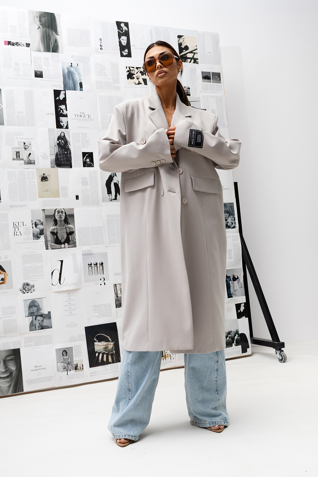 Płaszcz został wykonany z wysokiej jakości materiału i zaprojektowany z dbałością o detale. Szerokie ramiona oraz podwójne zapięcie na guziki nadają mu wyrazistej, strukturalnej formy, a duże kieszenie łączą funkcjonalność z modnym designem. Oryginalnym akcentem jest naszywka na rękawie i wszywka na ramieniu, które podkreślją charakter modelu.