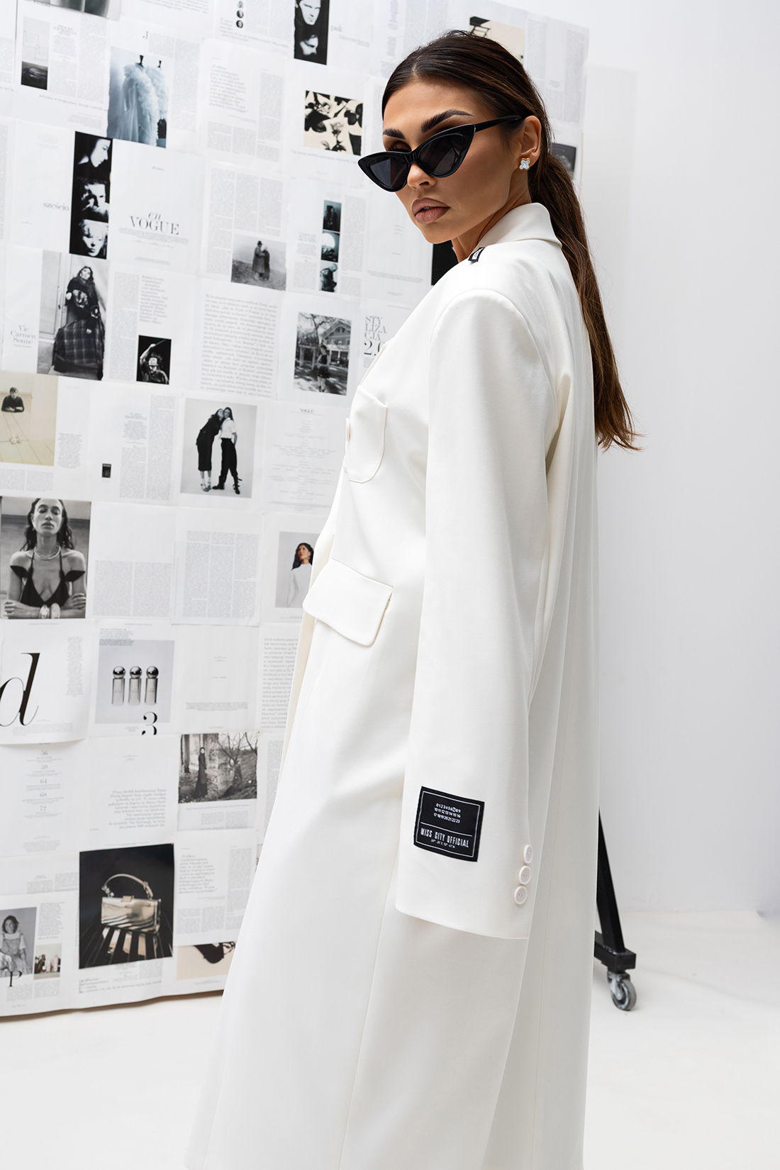 Płaszcz został wykonany z wysokiej jakości materiału i zaprojektowany z dbałością o detale. Szerokie ramiona oraz podwójne zapięcie na guziki nadają mu wyrazistej, strukturalnej formy, a duże kieszenie łączą funkcjonalność z modnym designem. Oryginalnym akcentem jest naszywka na rękawie i wszywka na ramieniu, które podkreślją charakter modelu.
