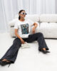 Model o nowoczesnym kroju, z okrągłym dekoltem i krótkimi rękawami, świetnie sprawdza się zarówno w casualowych, jak i eleganckich stylizacjach. Na przodzie znajduje się wyrazista grafika, która nadaje całości artystycznego i stylowego charakteru. Minimalistyczny, lecz wyrazisty design sprawia, że T-shirt  jest idealny do tworzenia zestawów na co dzień, spotkania z przyjaciółmi czy nawet bardziej formalne wyjścia.